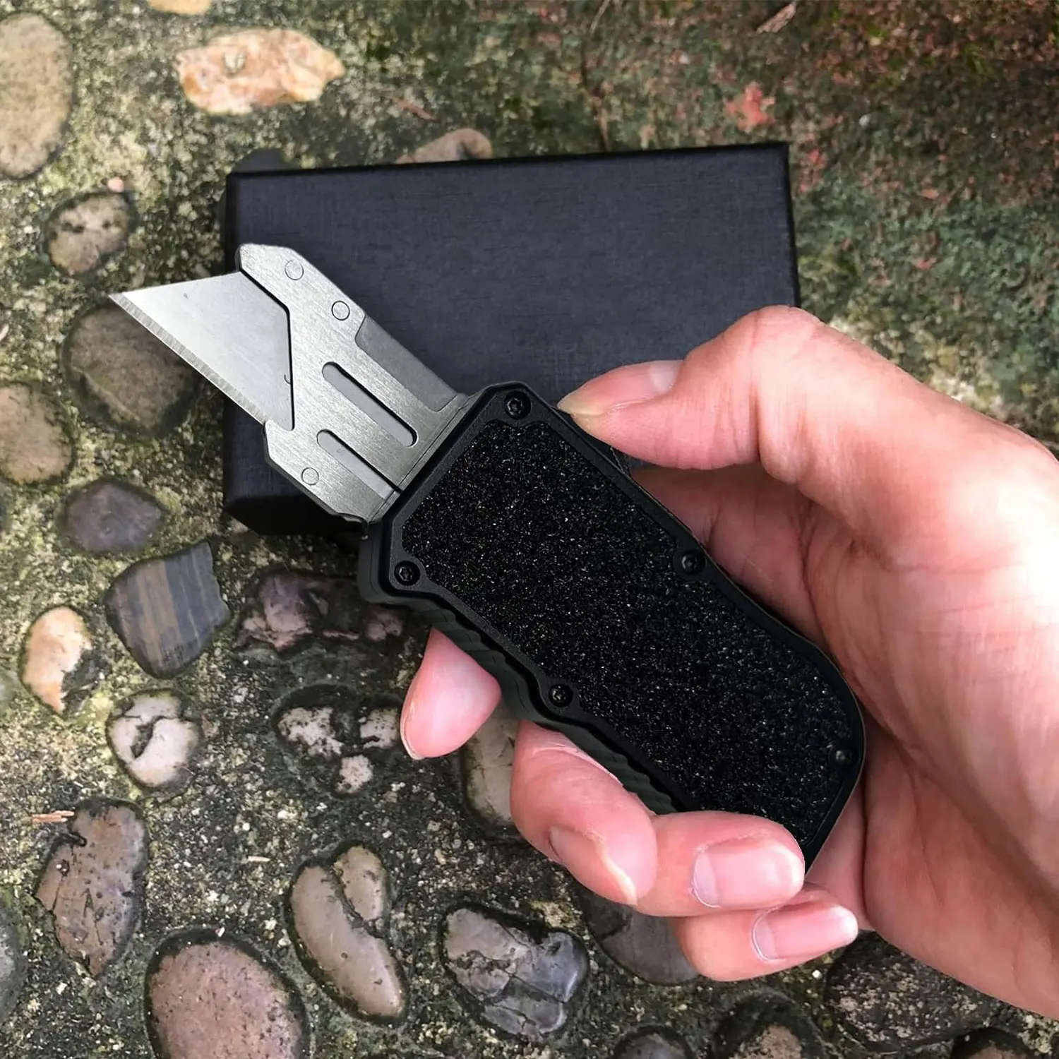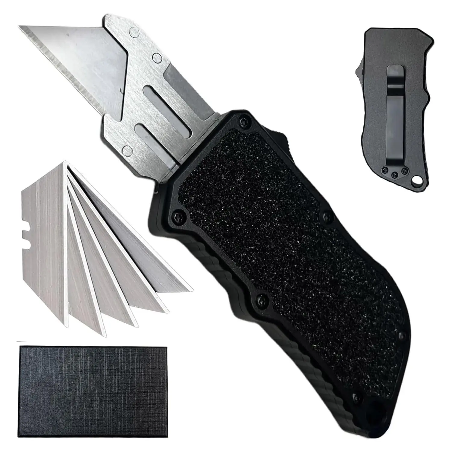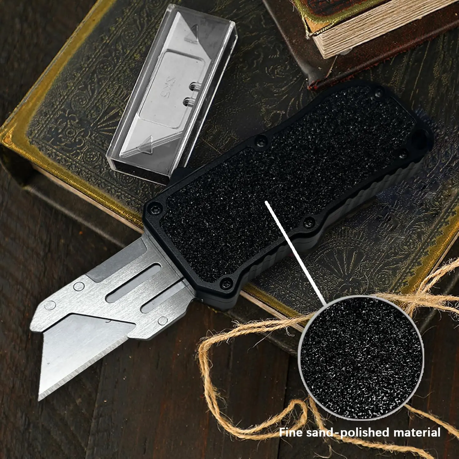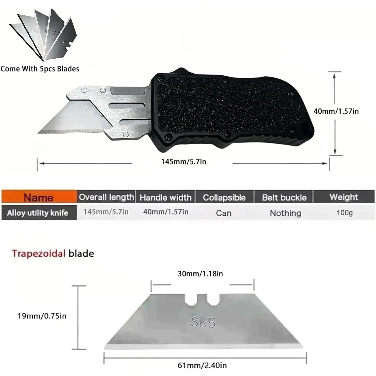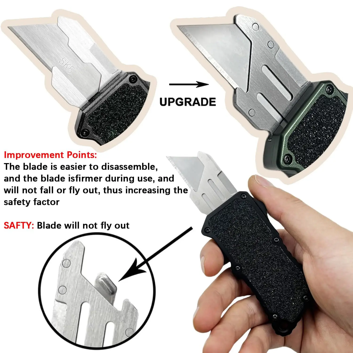 The knife includes five SK5 carbon steel blades for quick replacements. Changing blades is simple: extend the blade, press the fixing button, and reverse or replace. When blades run out, purchase locally for continued use. 🔧