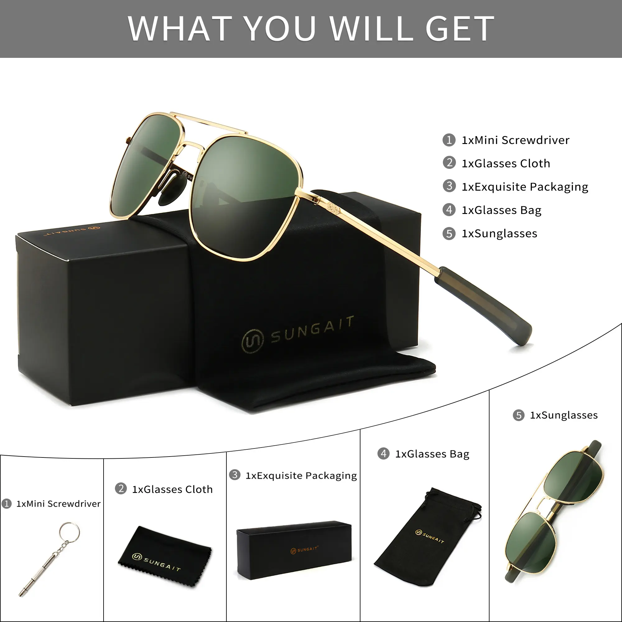 1 x Sunglasses 1 x Glasses cloth 1 x Glasses bag 1 x Exquisite packaging 1 x Screwdriver