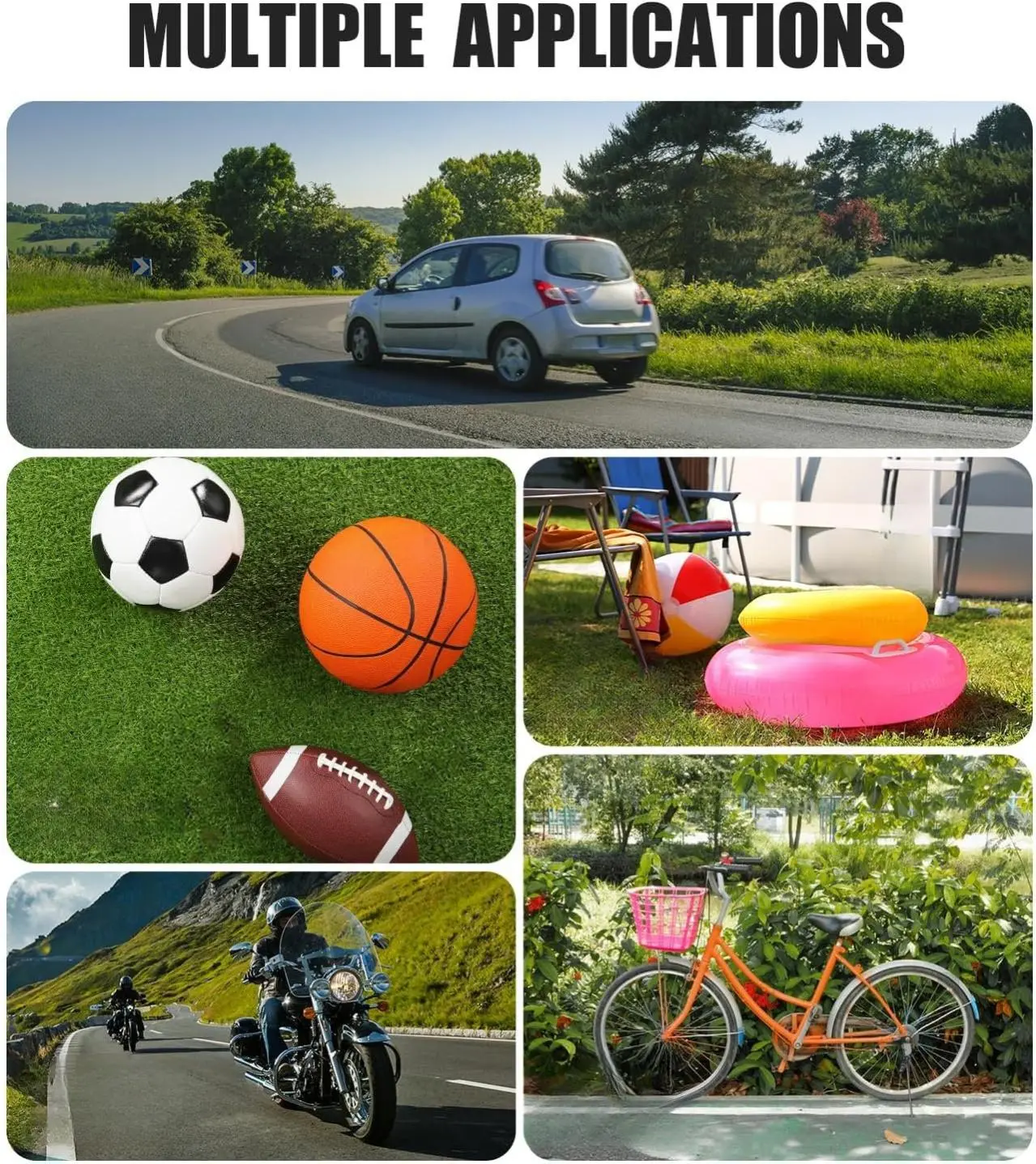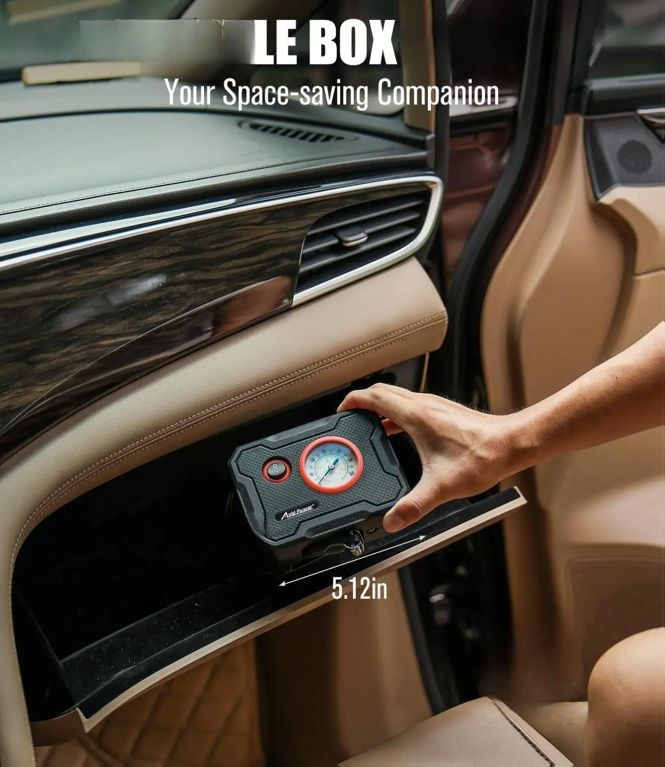 This 12V air compressor is a compact, hand-sized, box-shaped device, measuring 5.12*3.95*1.77 inches and weighing 0.8 lbs. Ideal for space-saving, it fits easily in your car for emergencies. Comes with a 12V cord, air hose, and adapters for neat organization. Perfect for on-the-go use.