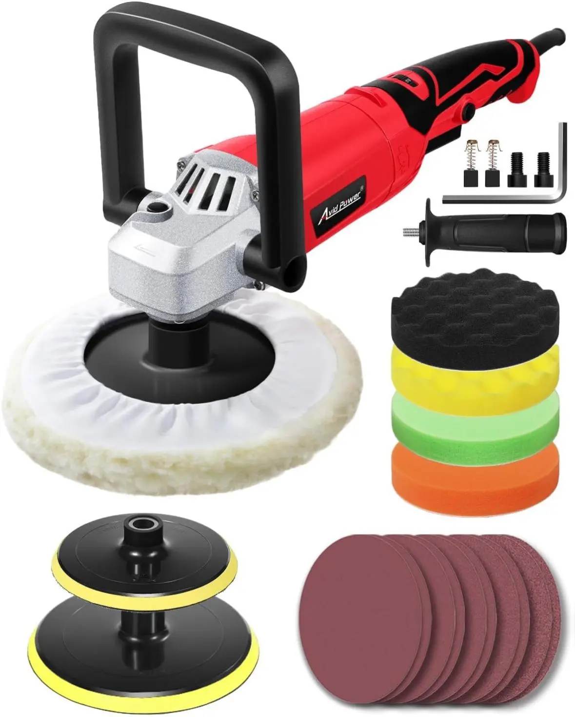 Your package includes: 1 AVID POWER buffer/polisher, 10 sandpapers, 4 6-inch polishing pads, 1 7-inch wool buffing bonnet, 1 6-inch backing disc, 1 7-inch backing plate, 1 detachable D handle, 1 side handle, 1 hex wrench, and an user manual. Perfect for polishing, removing swirls, scratches, and defects on painted vehicles.