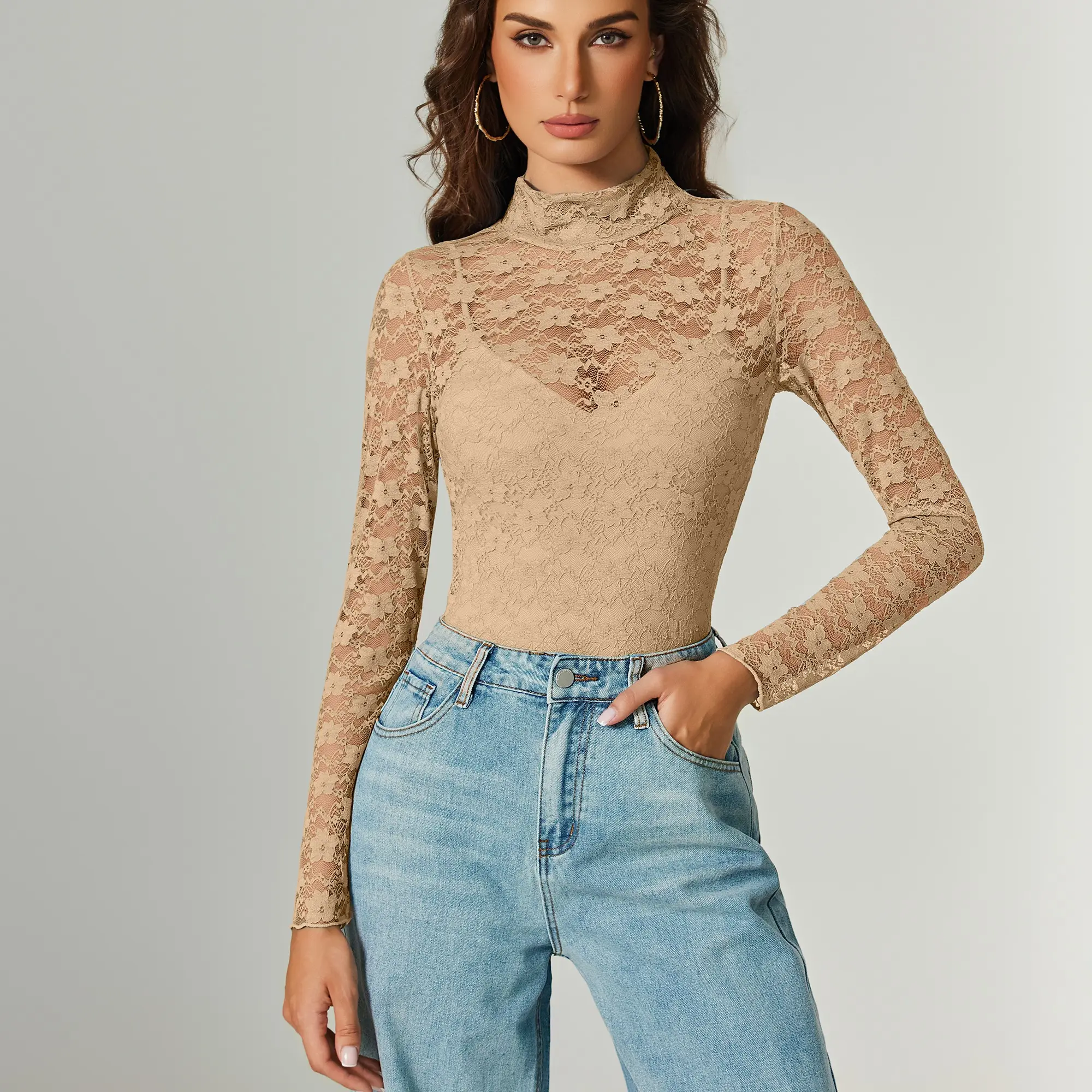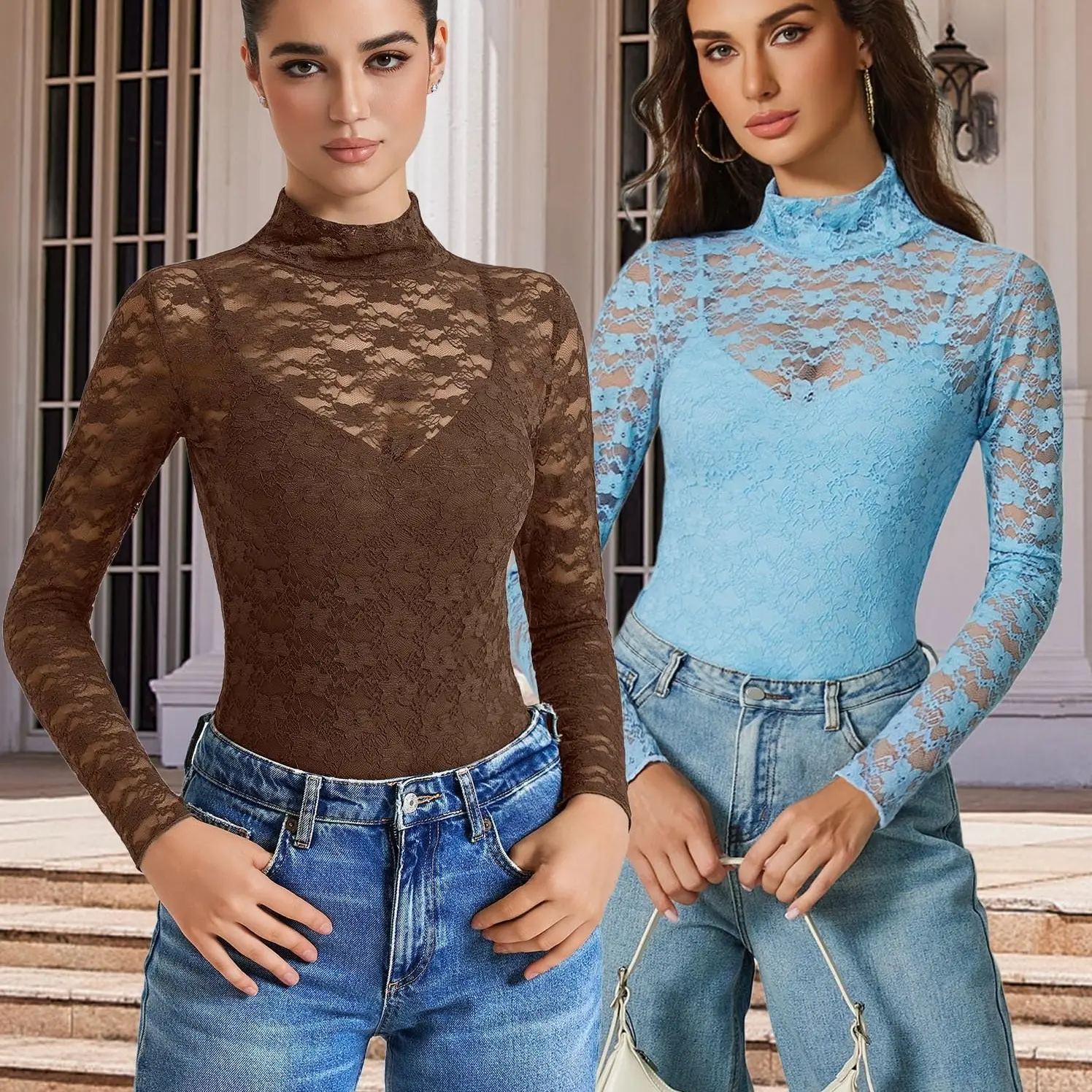 ·【Design】Bodysuits set feature a stylish and trendy design, two-piece set includes a long sleeve lace shirt and a spaghetti strap bodysuit. Turtle neck, lace crochet floral textured, provides a dressy and feminine look. The Snap closure design convenient for your dress.