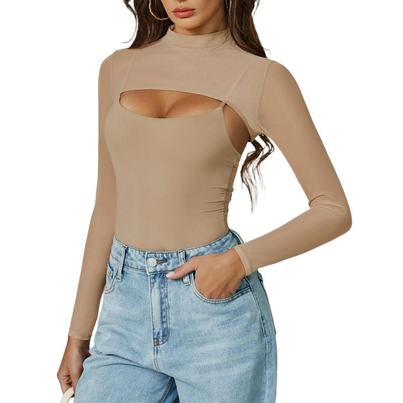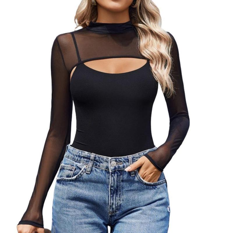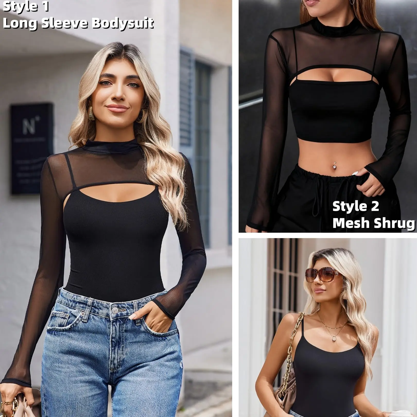 This mesh long sleeve bodysuit is crafted from 75% Nylon and 25% Spandex. It is extremely smooth, soft, skin-friendly, and breathable. The high stretch ensures a perfect fit. The two-piece design features a semi-high neck mesh long sleeve and an adjustable double-layer fabric cami bodysuit. It creates a visually hollowed-out effect.
