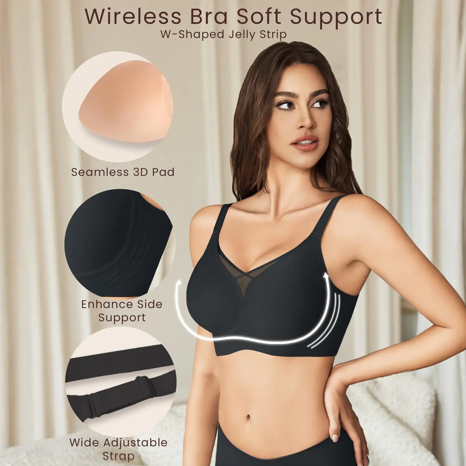 ·【W-shaped Jelly Strip Bras】Experience the perfect balance of comfort and support with our wireless bra. The W-shaped Jelly Strip and 3D molded cups work together to lift and shape your curves naturally, while eliminating the discomfort of traditional underwires, ensuring a buttery soft feeling all day long.