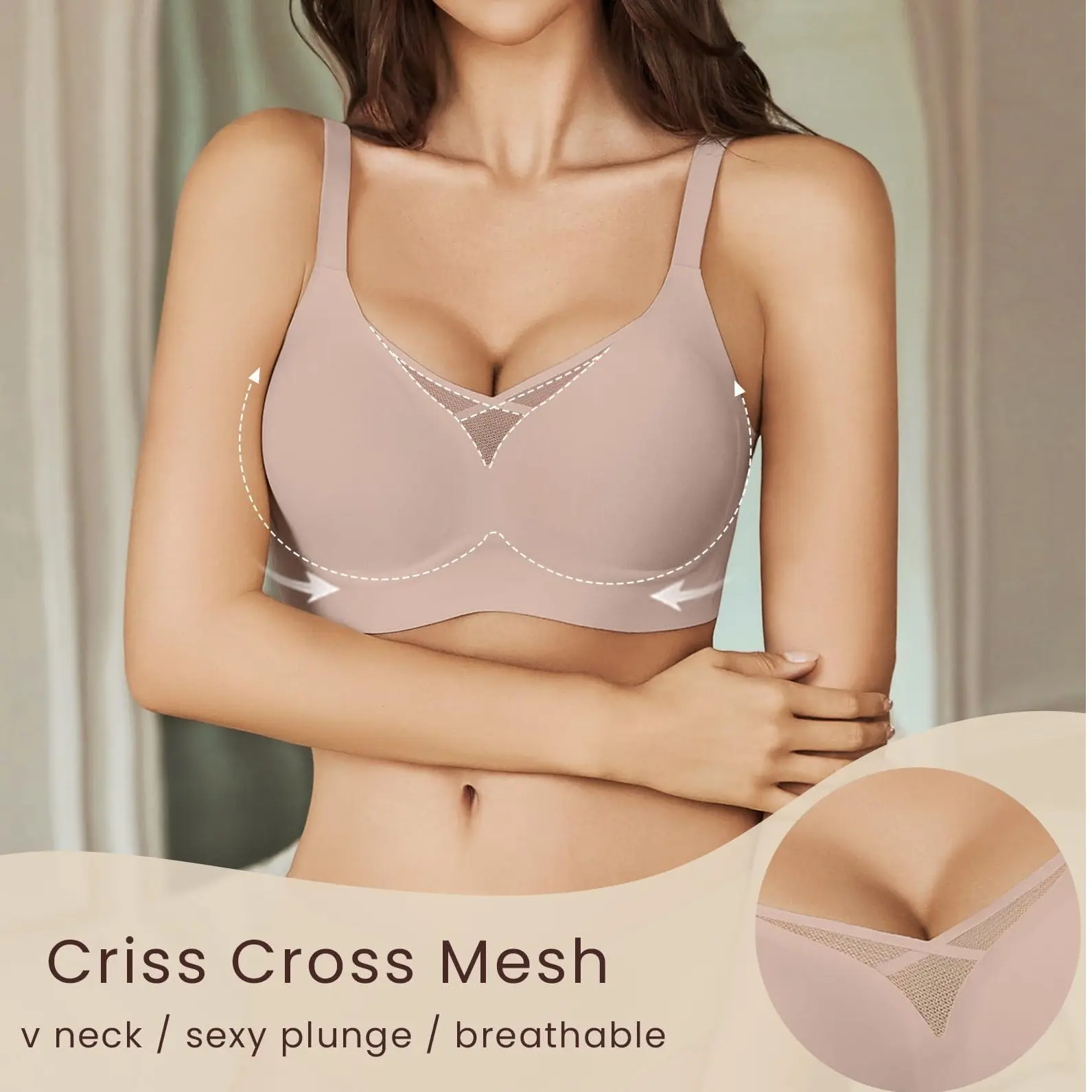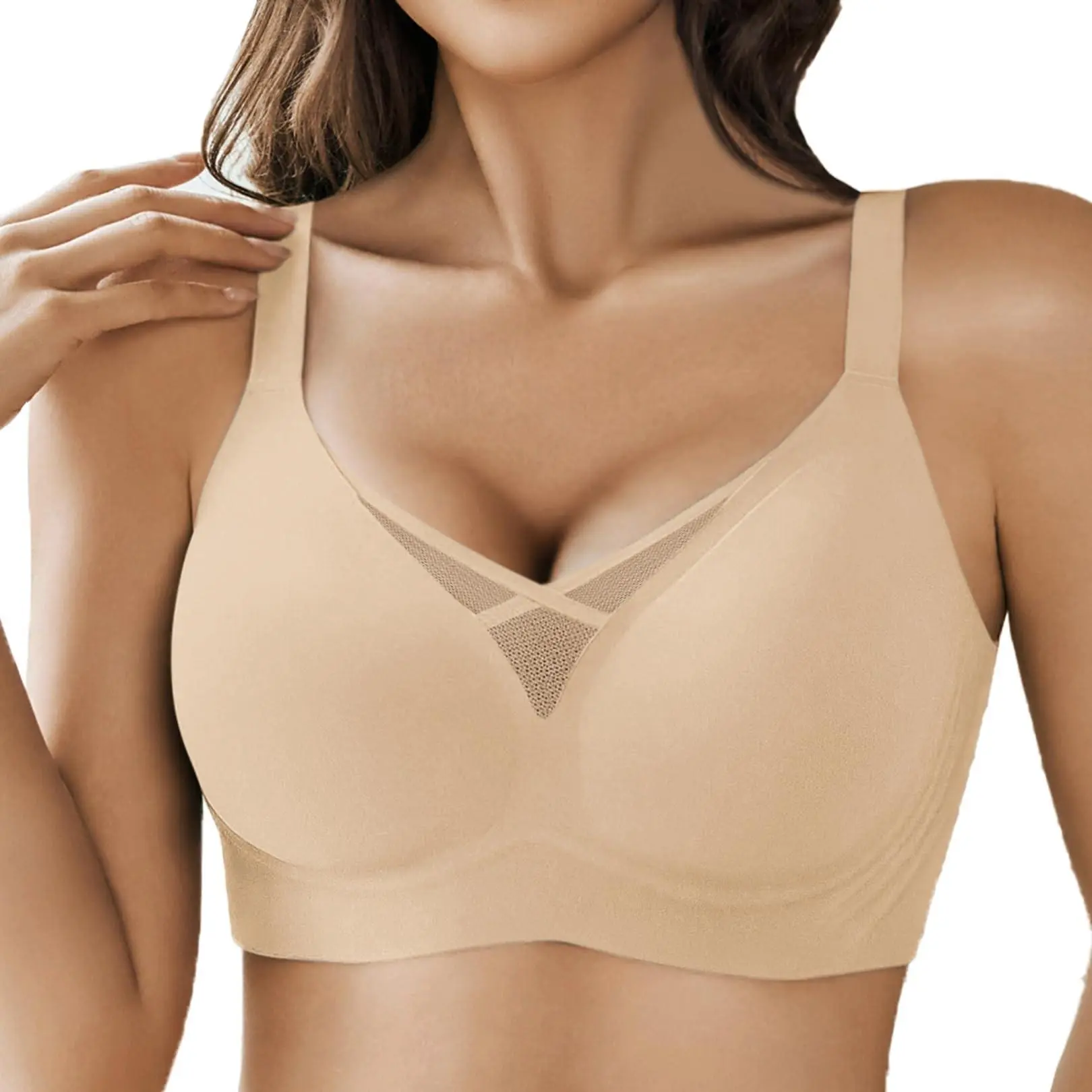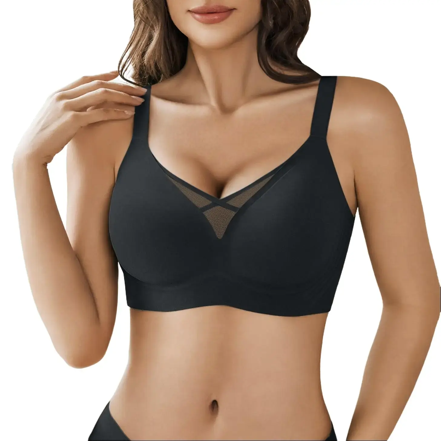 ·【Mesh Crossover Design】The exquisite criss-cross mesh detailing creates a captivating front design, adding a touch of feminine sophistication to your everyday wear. With removable padding, you can easily customize your look - choose between enhanced curves or a more natural silhouette. This seamless bra combines elegance with practicality, making it your perfect choice for any occasion.