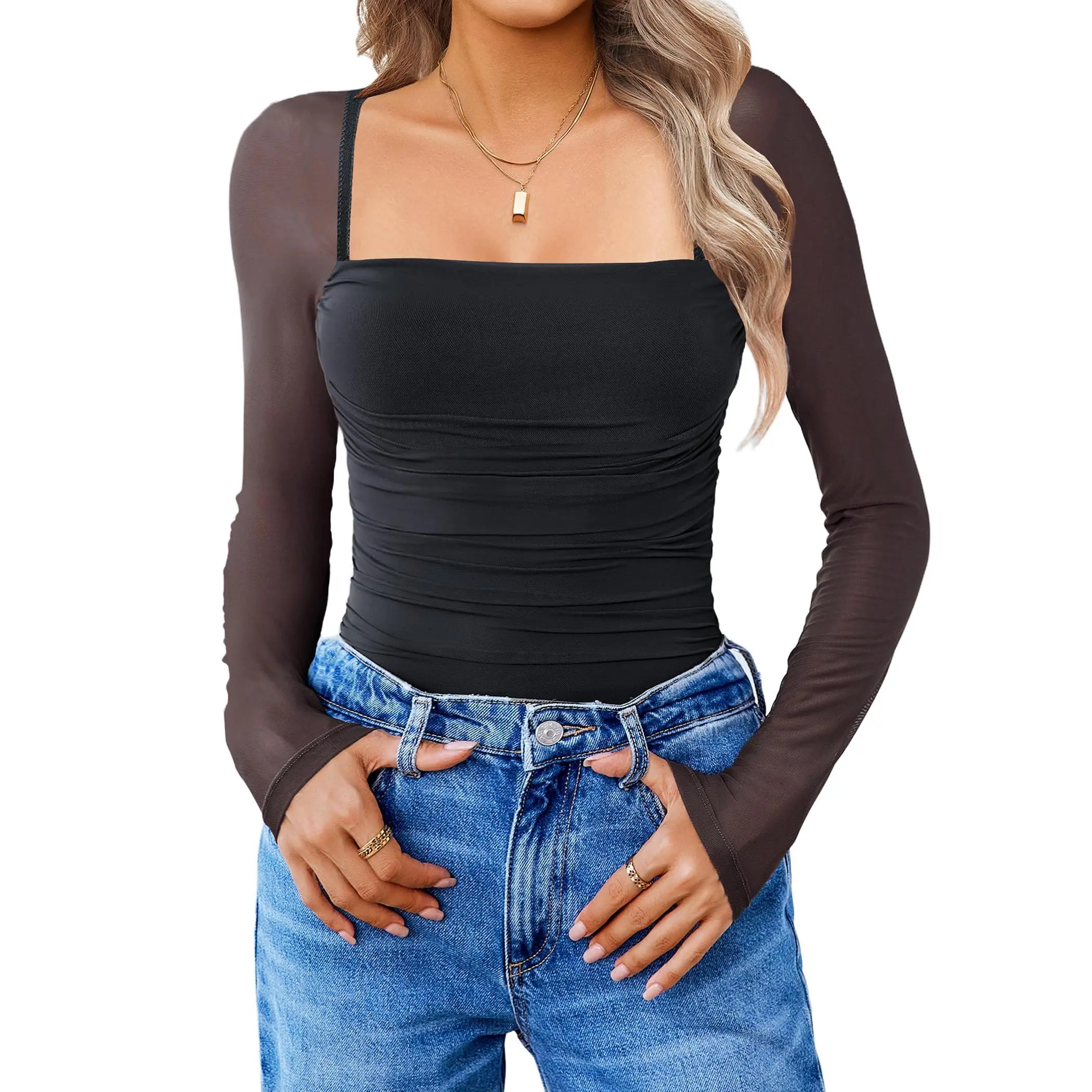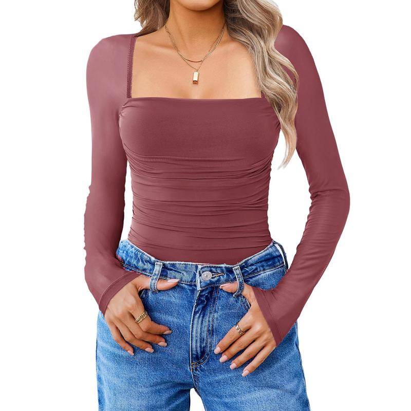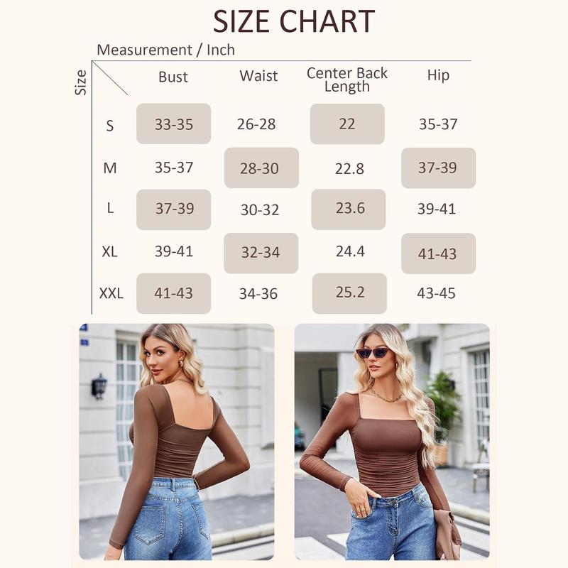 ·Design: Slimming trendy body suits for women, featuring a sheer mesh long sleeve, square neck bodysuit, with layered ruched decoration from chest to waist with super soft material, making it slimmer fitting, bringing a sense of detail design to basic styles. And the slimming bodysuit comes with button closure at the crotch.