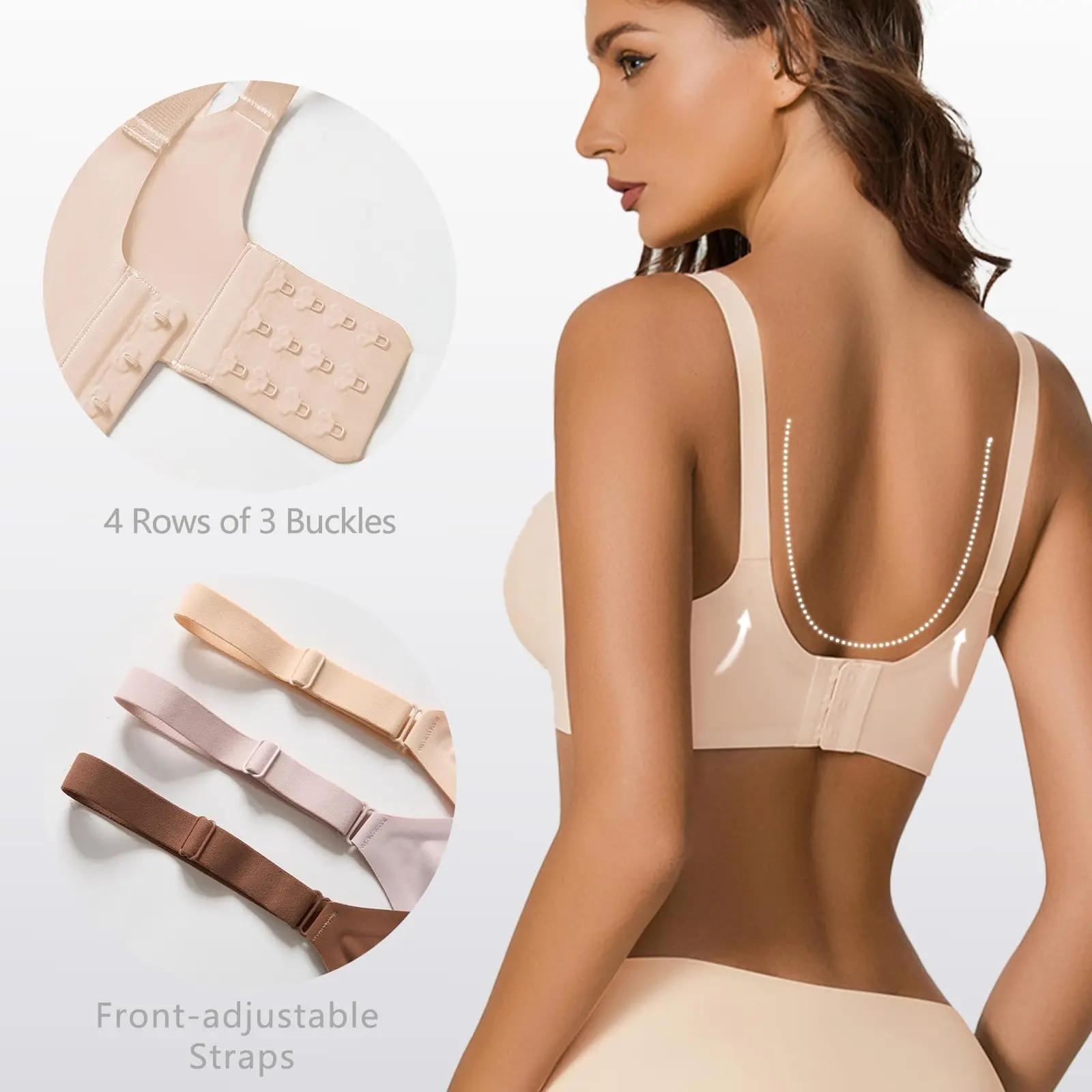 ·【Seamless & Smooth】 This wide back bra have adjustable front clasp and wider straps. A semi-fixed design at the bottom of the bra pads, and has openings at the top of the cup lining, can organize the cup pads after washing or reach in here to remove them.