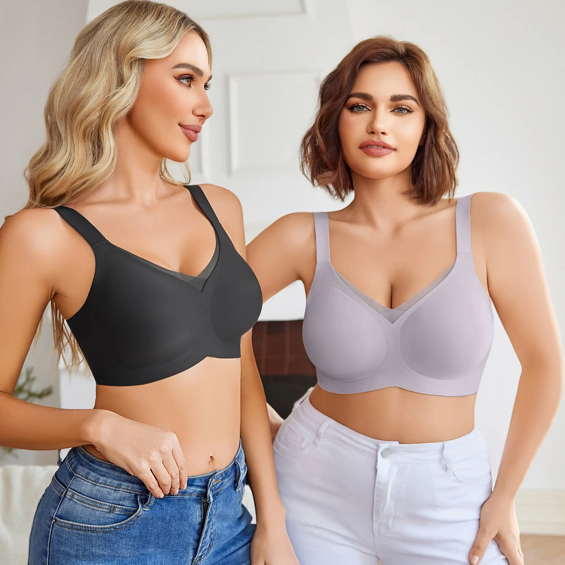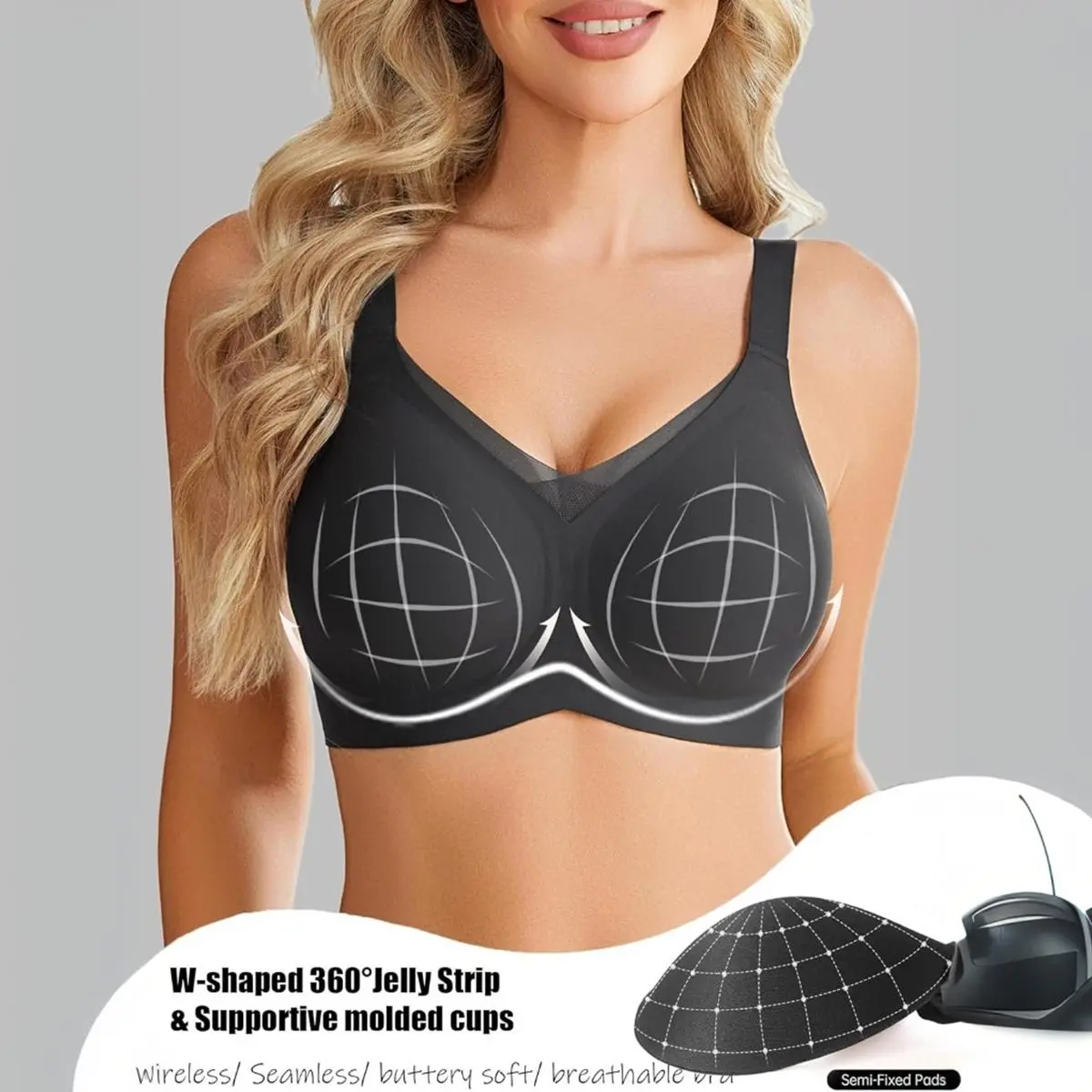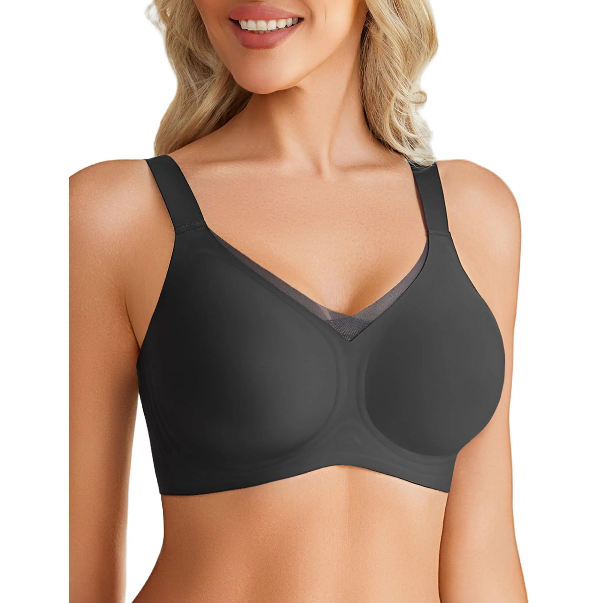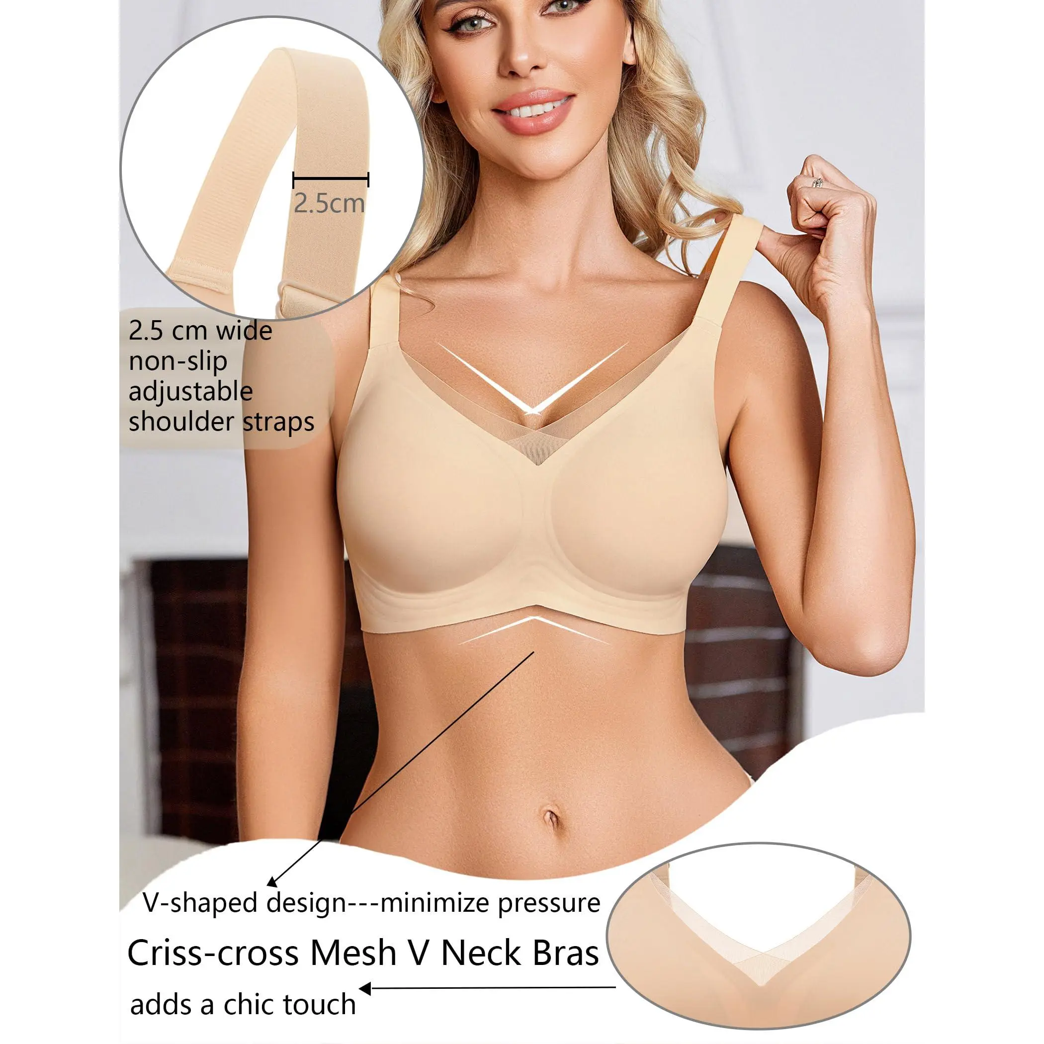 ·WIRELESS COMFORT WITH LIFT: Our wirefree bras feature W-shaped jelly support and 3D molded cups, offering 360° support and lift without underwire. The sexy V-neck bralette design with delicate criss-cross mesh adds a chic touch, matching well with t-shirts and perfect for everyday wear.