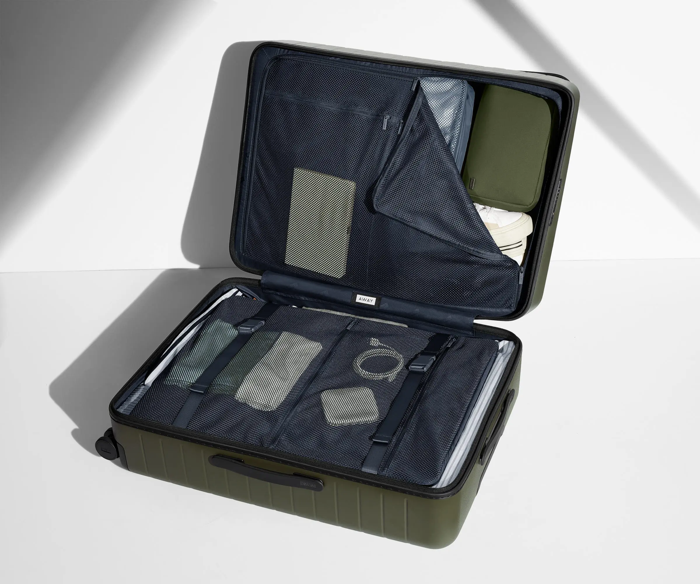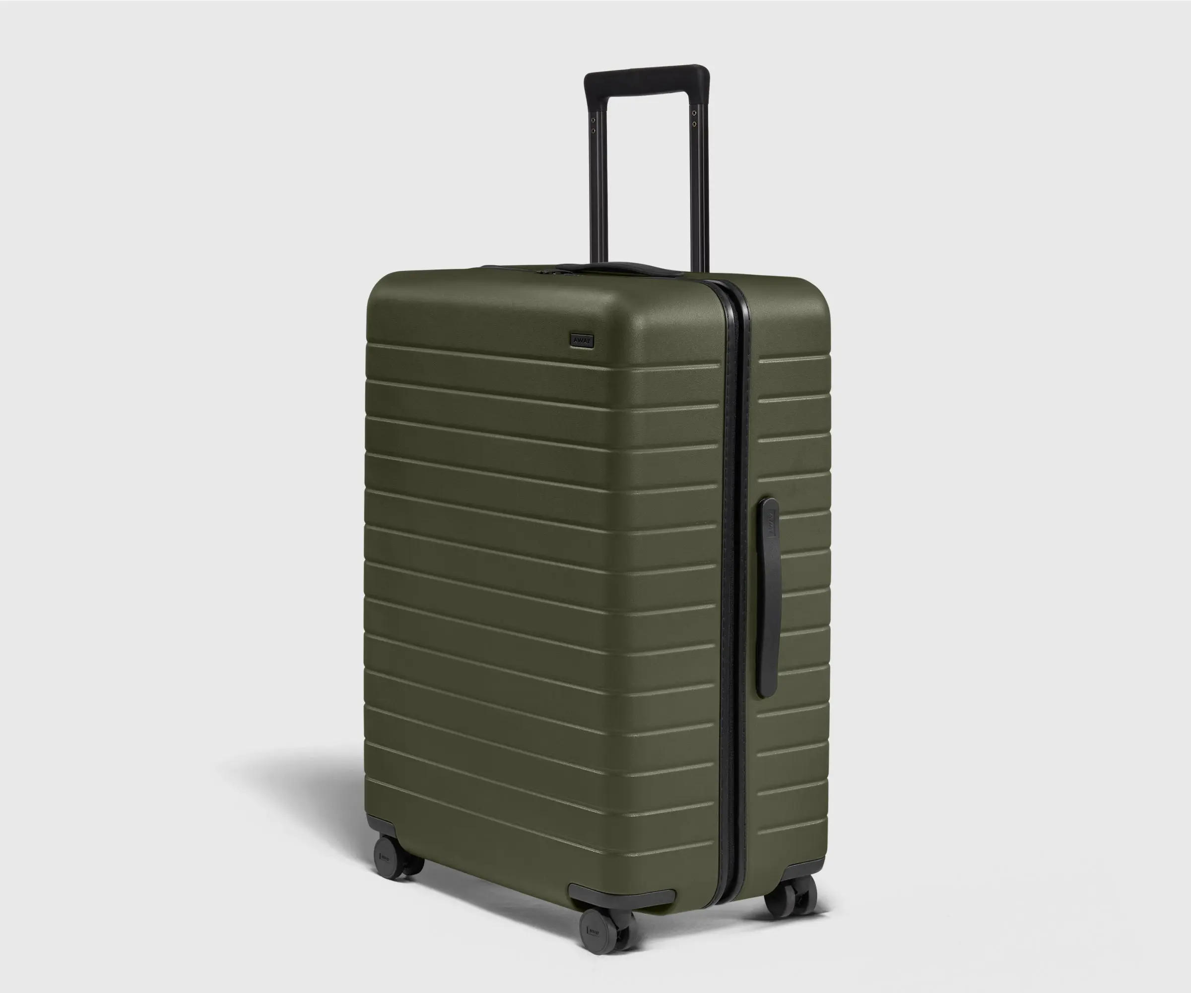 I love Away luggage. I finally obtained a full set with the purchase of the large hard shell luggage. The luggage is the perfect size and durable, which is needed because the airline ground crew usually destroys my luggage after a few trips. The large is able to hold all of my outfits (usually 8-10) for a 4-days trip. I still manage to have room for toiletry bags. I would definitely recommend getting Away luggage!