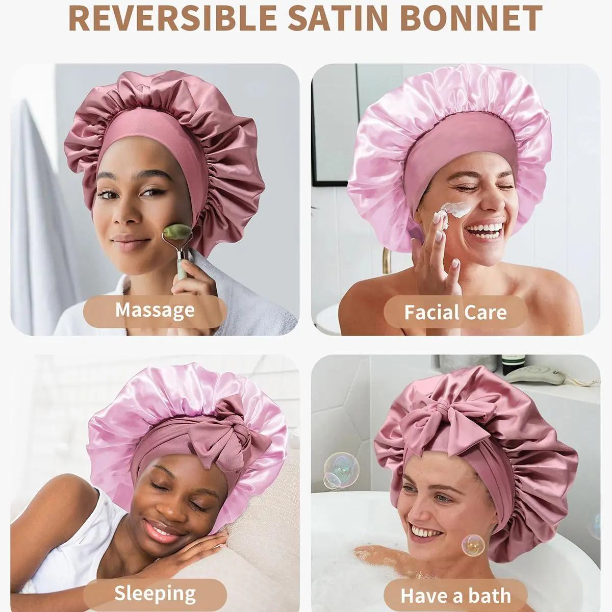 【Fashionable and Wide Use】:Reversible satin bonnet can be used daily, can be used in many occasions, sleeping, housework, makeup, fitness, running, yoga, face washing, showering and so on. Some chemotherapy patients can also apply.