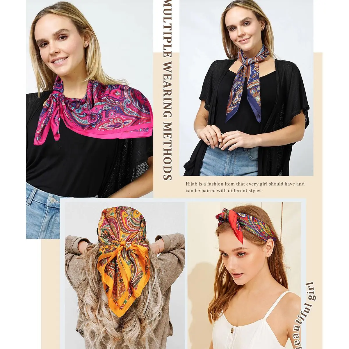 PACKAGE DETAILS AND WASHING INSTRUCTIONS:The package contains 4 square scarves of different colors, can be matched according to needs. Please hand wash the headscarf gently under 30℃ and hang or lay it flat to dry