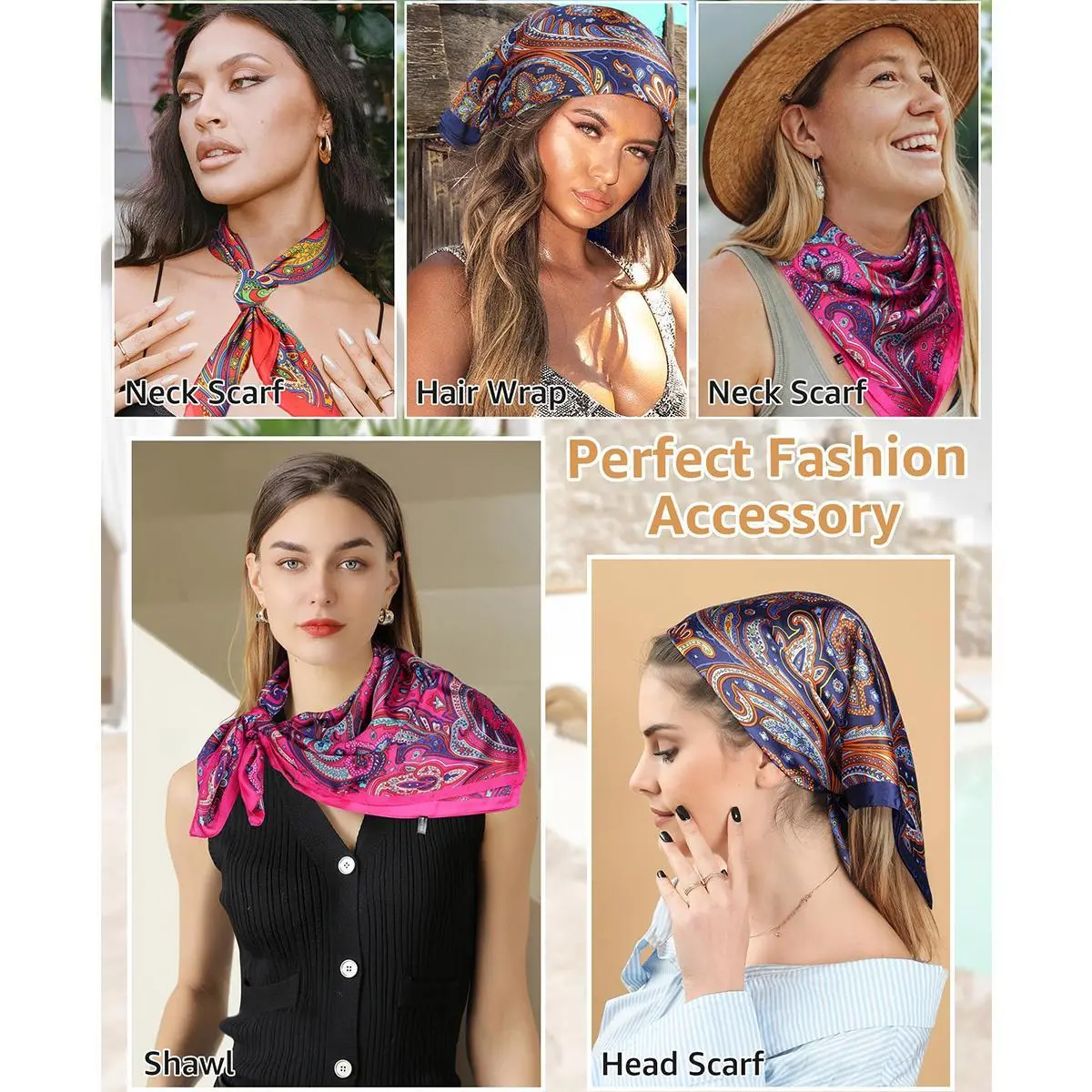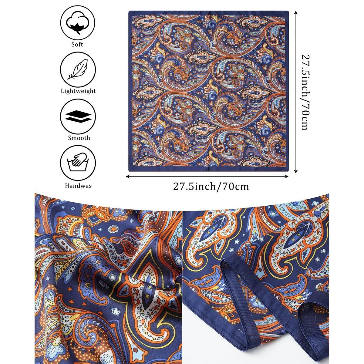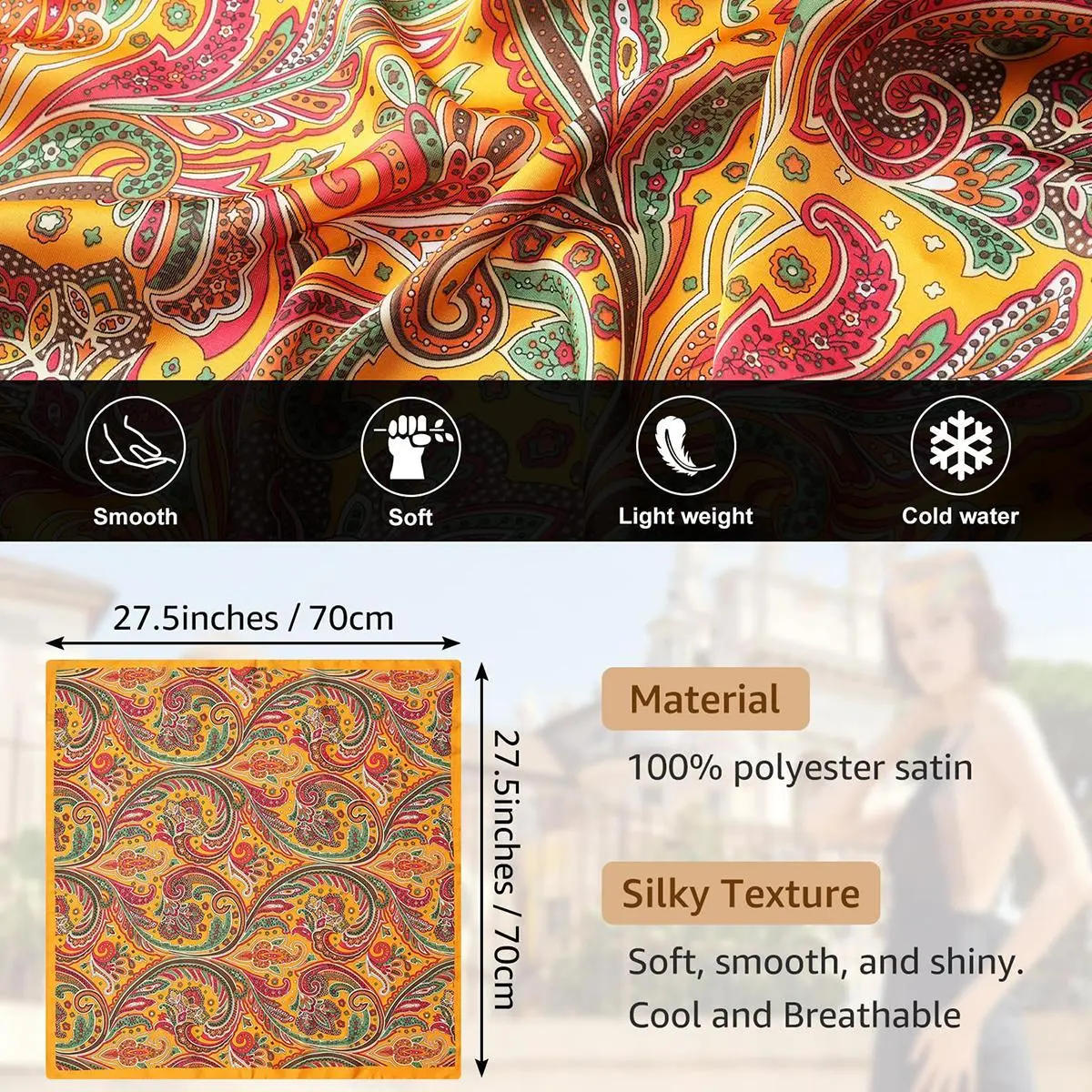 PREMIUM MATERIAL - The square head scarf is made of polyester satin, SILKY smooth, easy to iron, 27.5x27.5 inches/ 70x70 cm perfect for sleeping, outdoor parties, work and travel