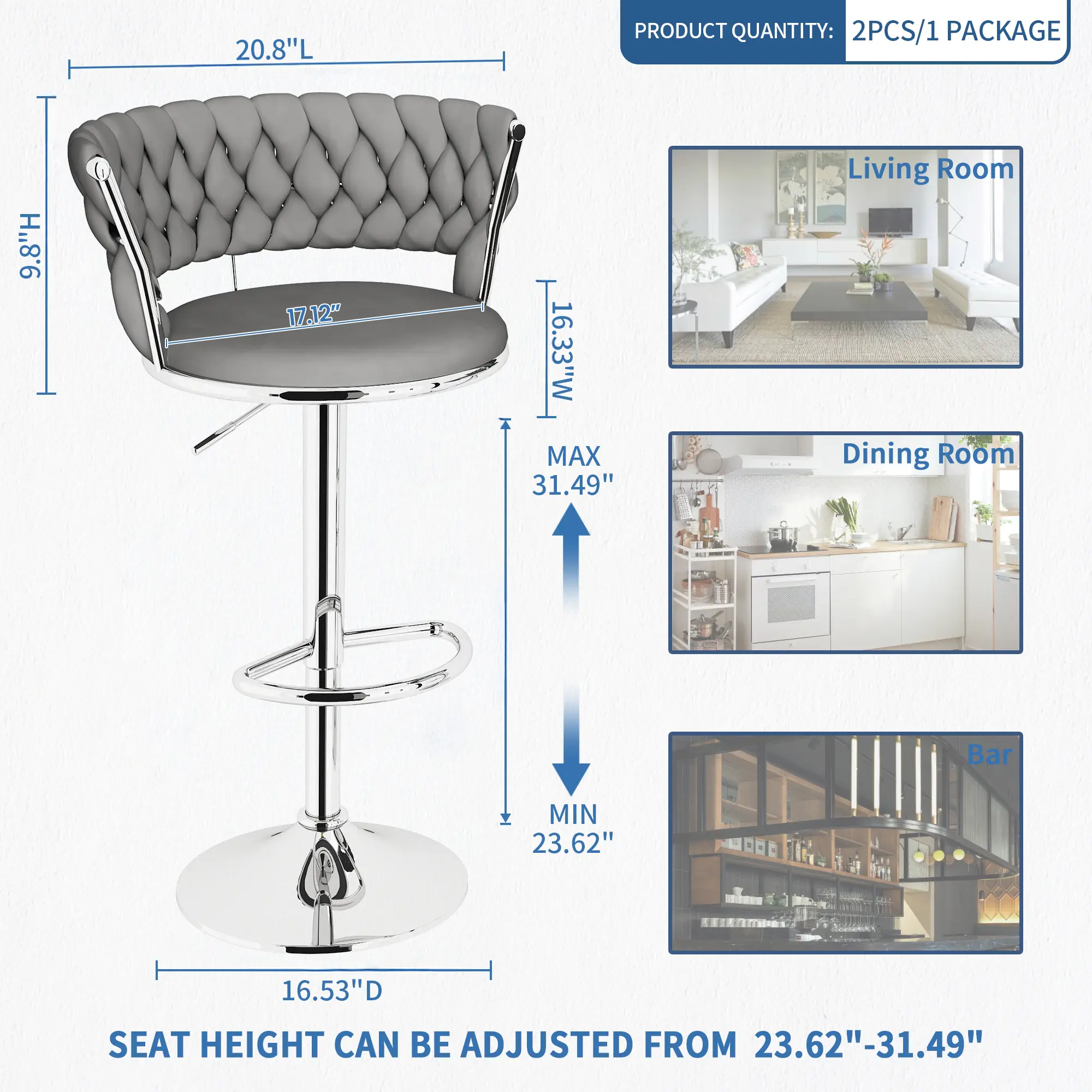 【ADJUSTABLE BAR CHAIRS】- Barstools can adjust from 23.62-31.5” so you can seat guests of every height, and the seat is a generous 17.12” wide , with a weight capacity of up to 350 lbs. The chairs sit on a high-intensity pneumatic rod that rotates 360 degrees for full mobility. So lean back, kick up your feet on the built-in footrest, and enjoy.