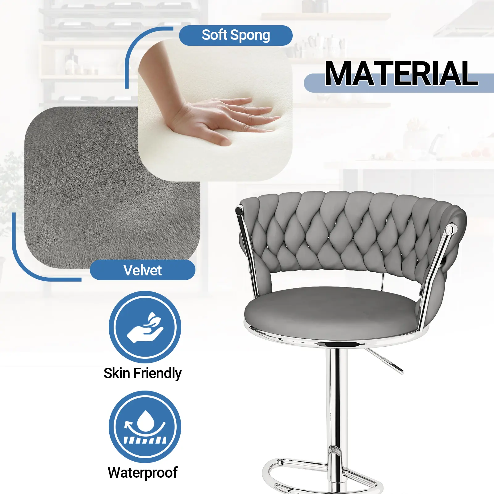 【UPHOLSTERED COUNTER STOOLS】-The velvet and a steel chrome base make cleaning a breeze, so your chair will always look and feel brand new.Combining a stylish, modern design with unmatched durability, you’ll be able to enjoy these chairs for years to come.