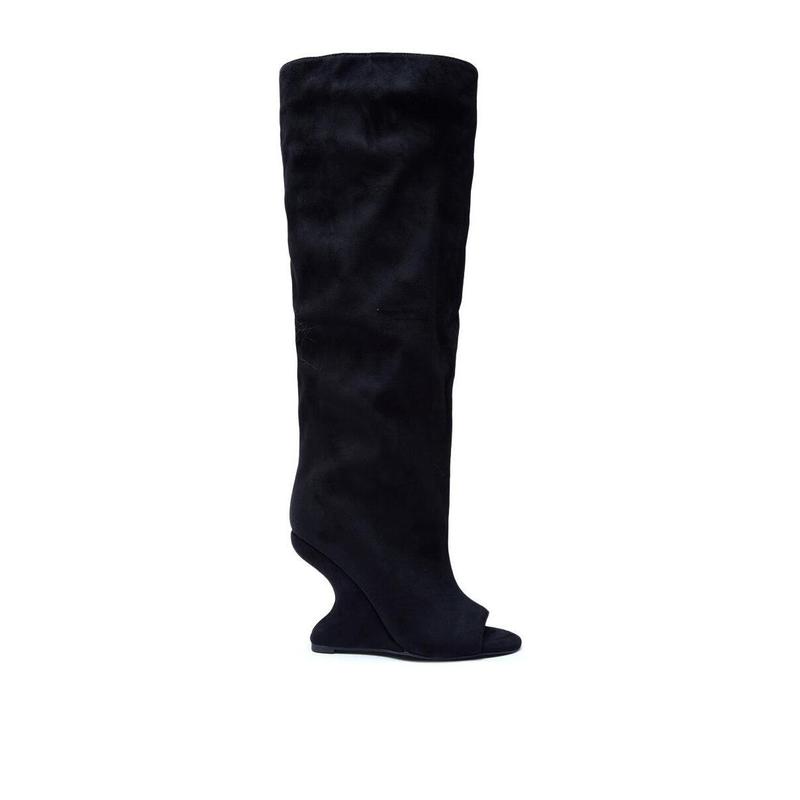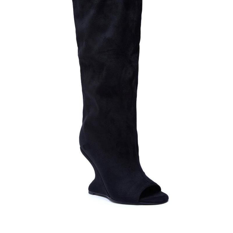 Elevate your fits with the AZALEA WANG Vincent Black Faux Suede Open Toe Boot. Crafted from buttery faux suede, this minimalist-chic boot boasts an almond peep toe, an inverted wedge heel, and a knee-high shaft with a pull-on fit.- Faux Suede Upper- Open Almond Toe- Inverted Wedge Heel- Knee-High Shaft- Imported(all measurements approximate from size 7.5)- 4.25” Heel Height- 17.5” Shaft Height- 18.5” Shaft Opening Circumference- 13.5” Calf CircumferenceProduct ID: 1075649