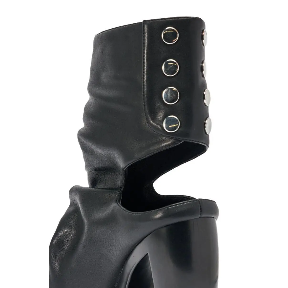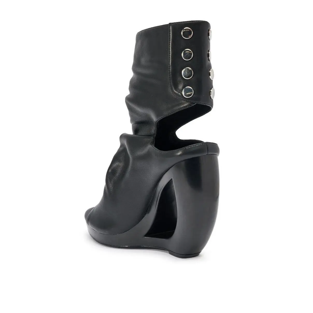 Turn sidewalks into runways. The AZALEA WANG Circos Black Wedge Bootie is crafted from sleek faux leather and features an open almond toe, a uniquely curved wedge heel with a cut out accent, an ankle-high shaft that wraps around the upper ankle and exposes the heel, a cushioned faux leather insole, and a panel of silver snap-button fastenings on the back of the ankle. - Faux Leather Upper- Open Almond Toe- Wedge Heel- Ankle-High Shaft- Imported(all measurements approximate from size 10)- 5” Heel Height- 6.5” Shaft Height- 11” Shaft Opening CircumferenceProduct ID: 1084441