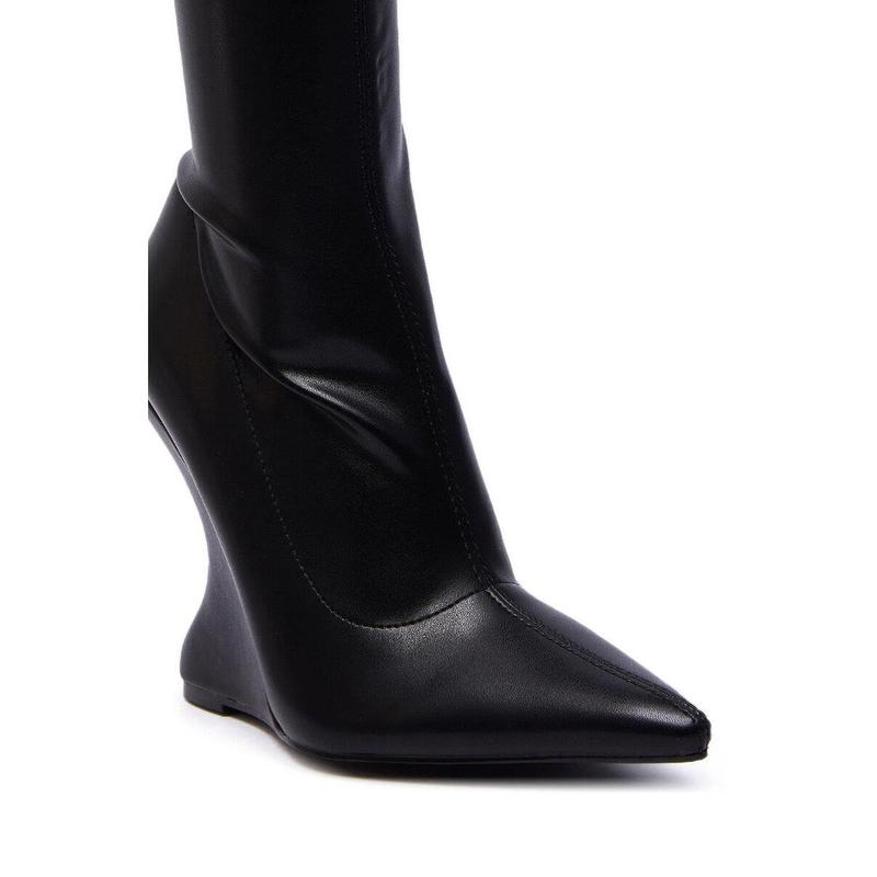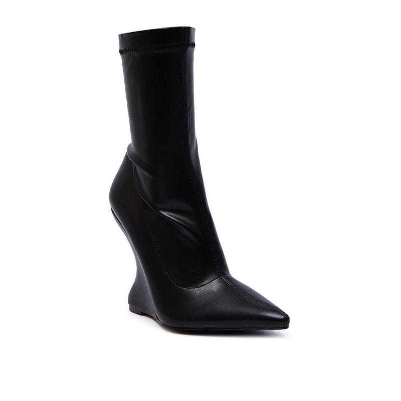 Hot to trot in The AZALEA WANG Daman Black PU Wedge Bootie. Crafted from buttery faux leather, these booties feature an above-the-ankle shaft, a pointed toe, a tonal inverted wedge heel, and an inner ankle zip closure. Try pairing with your favorite pair of jeans or a mini skirt for a sleek and sexy finish.- Faux Leather Upper- Pointed Toe- Inverted Wedge Heel- Imported(all measurements approximate from 7.5)- 5” Heel Height- 7.5” Shaft Height- 11” Shaft Opening CircumferenceProduct ID: 1055759