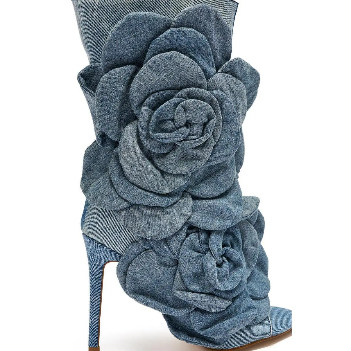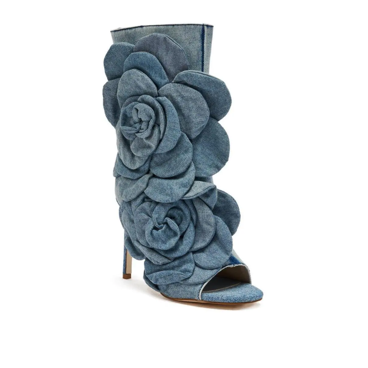 Talk denim to me.  The AZALEA WANG Delmare Denim Floral Open Toe Bootie is crafted from a light-wash denim fabric and features a mid-calf shaft adorned with 3D, coordinating floral appliques, an open almond toe, a slim stiletto heel, and an inner ankle zip closure. - Denim Textile Upper- Open Almond Toe- Stiletto Heel- Mid-Calf Shaft- Imported(all measurements approximate from size 7.5)- 4.25” Heel Height- 7.75” Shaft Height- 13.5” Shaft Opening CircumferenceProduct ID: 1072156