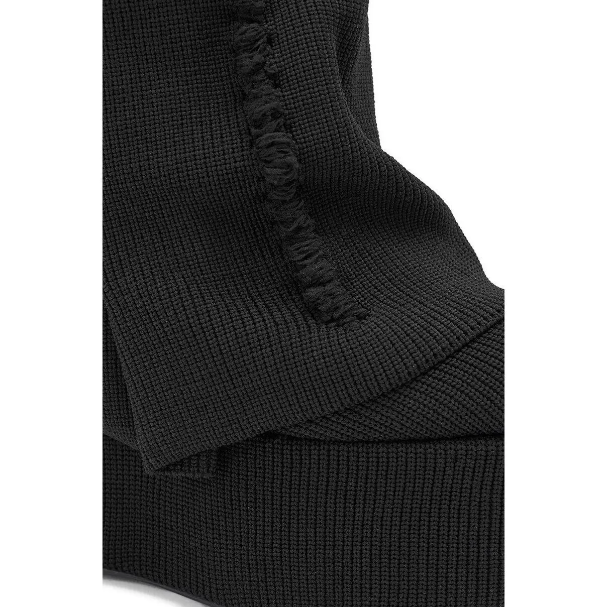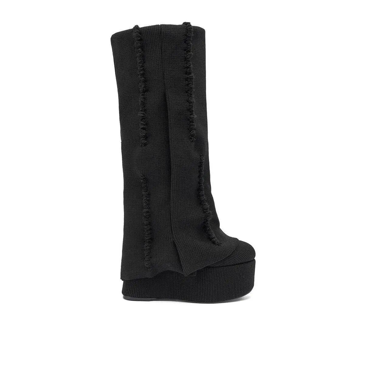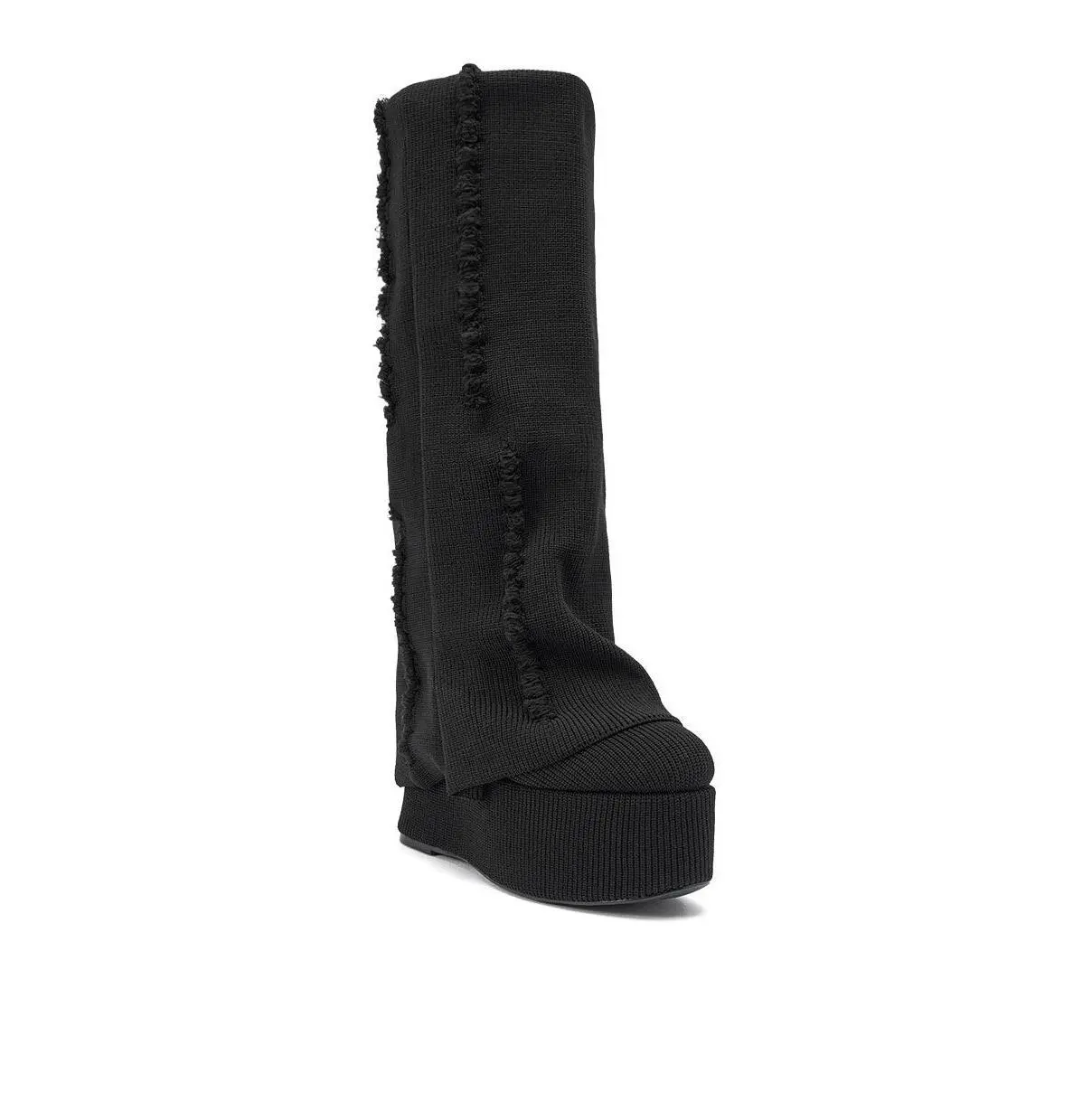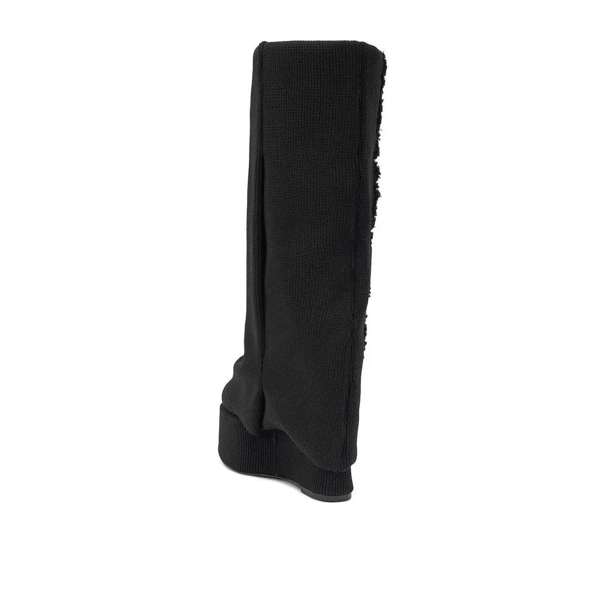 Black knit foldover platform boots, perfect for everyday wear, winter styling, and night out looks. These bold black platform wedge boots deliver a futuristic edge with their ultra-tall ribbed knit sole and slouchy, textured upper featuring exposed seam detailing for a deconstructed, avant-garde look. Designed to make a statement, they combine dramatic height with a comfortable, rounded platform base,  knee-high, slip-on fit, and a fold-over shark boot silhouette, perfect for adding runway-worthy attitude to any outfit. - Knit Upper- Round Toe- Platform Sole- Wedge Heel- Knee-High Shaft- Imported(all measurements approximate from size 10)- 2.5” Sole Height- 6” Heel Height- 13” Shaft Height- 18” Shaft Opening Circumference- 17” Calf CircumferenceProduct ID: 1085863