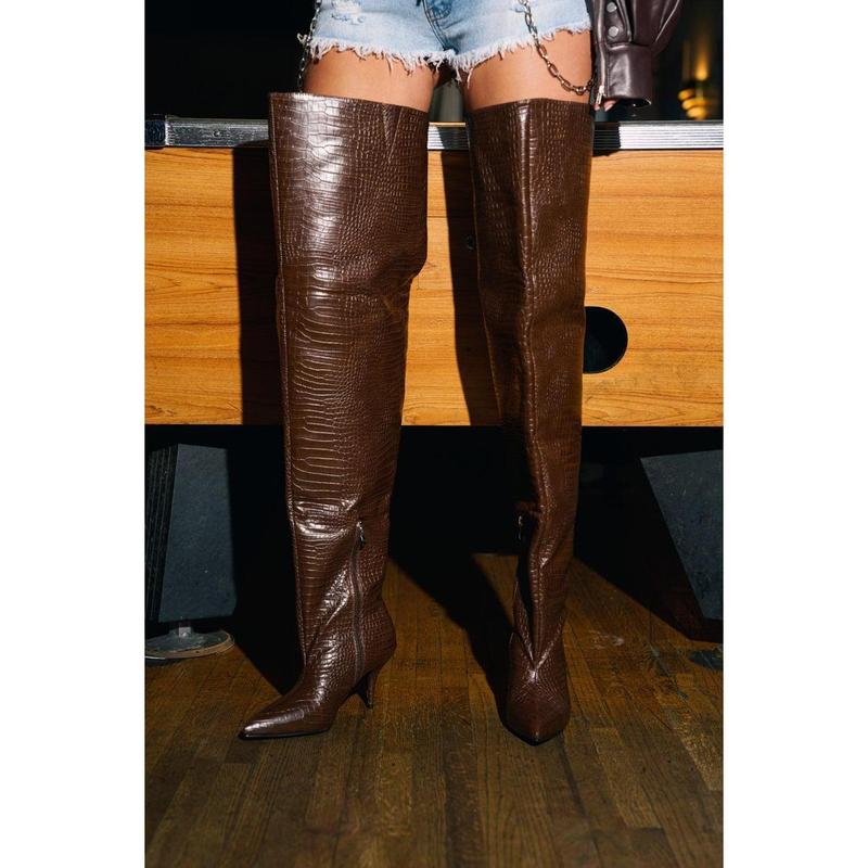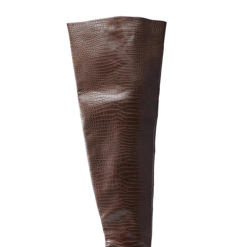 The sky’s the limit in The AZALEA WANG Halina Brown Croc Stiletto Boot. These seriously sexy shoes are crafted from glossy faux crocodile leather and boast a pointed toe silhouette, a slim stiletto heel, and a nearly hip-high shaft. Complete with an inner ankle zipper closure. Style them with a micro mini skirt, bra top, and a body chain for the vampiest look imaginable.- PU Upper- Pointed Toe- Stiletto Heel- Thigh-High Shaft- No Stretch- Imported(all measurements approximate from size 7.5)- 3.25” Heel Height- 29” Shaft Height- 25” Shaft Opening Circumference- 16” Calf CircumferenceProduct ID: 1042175