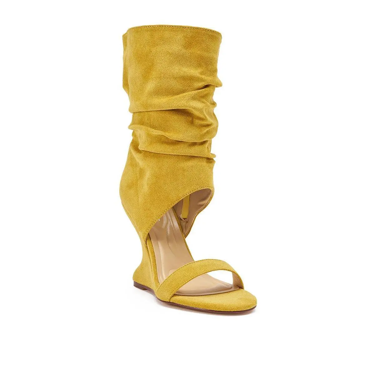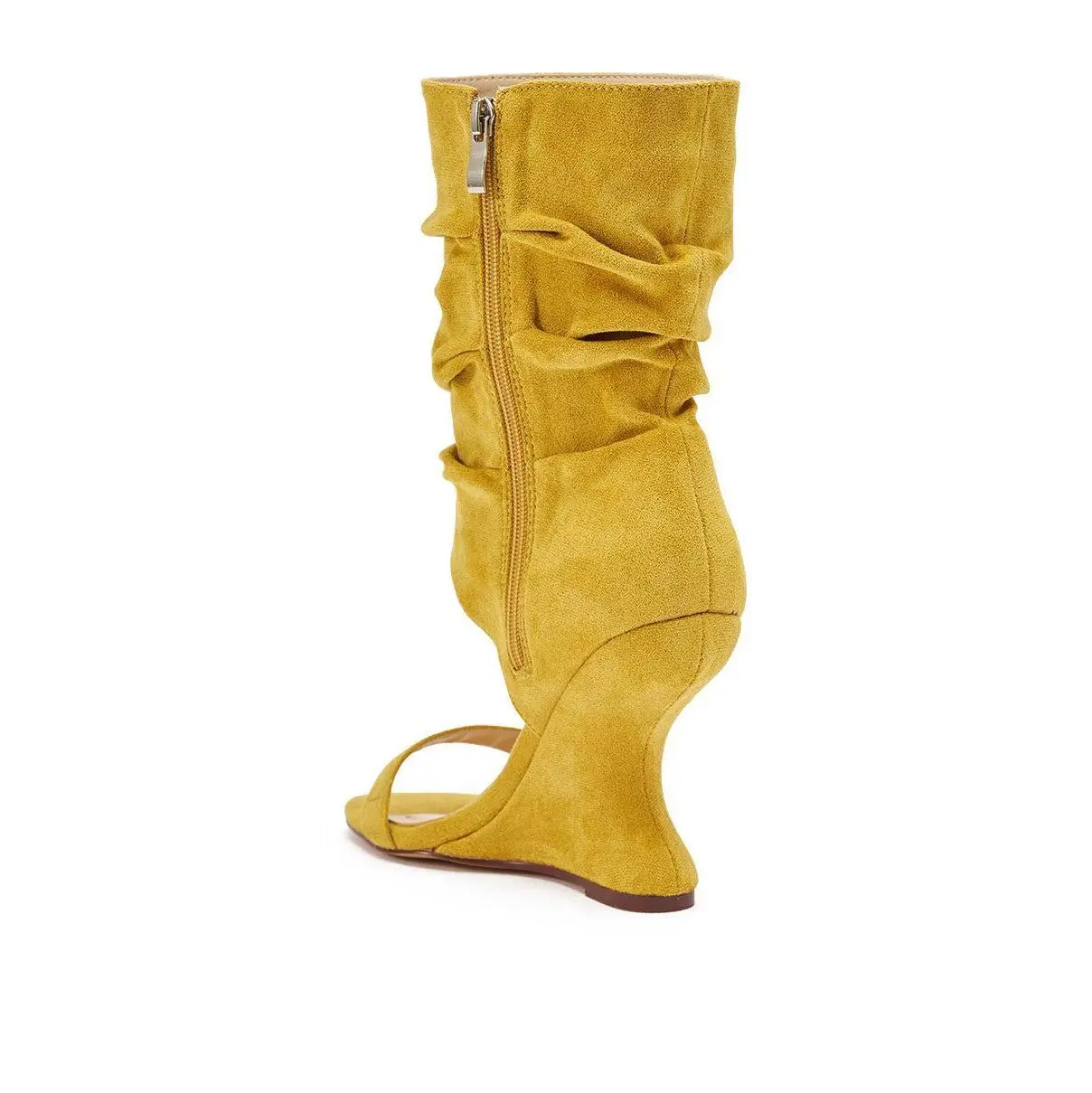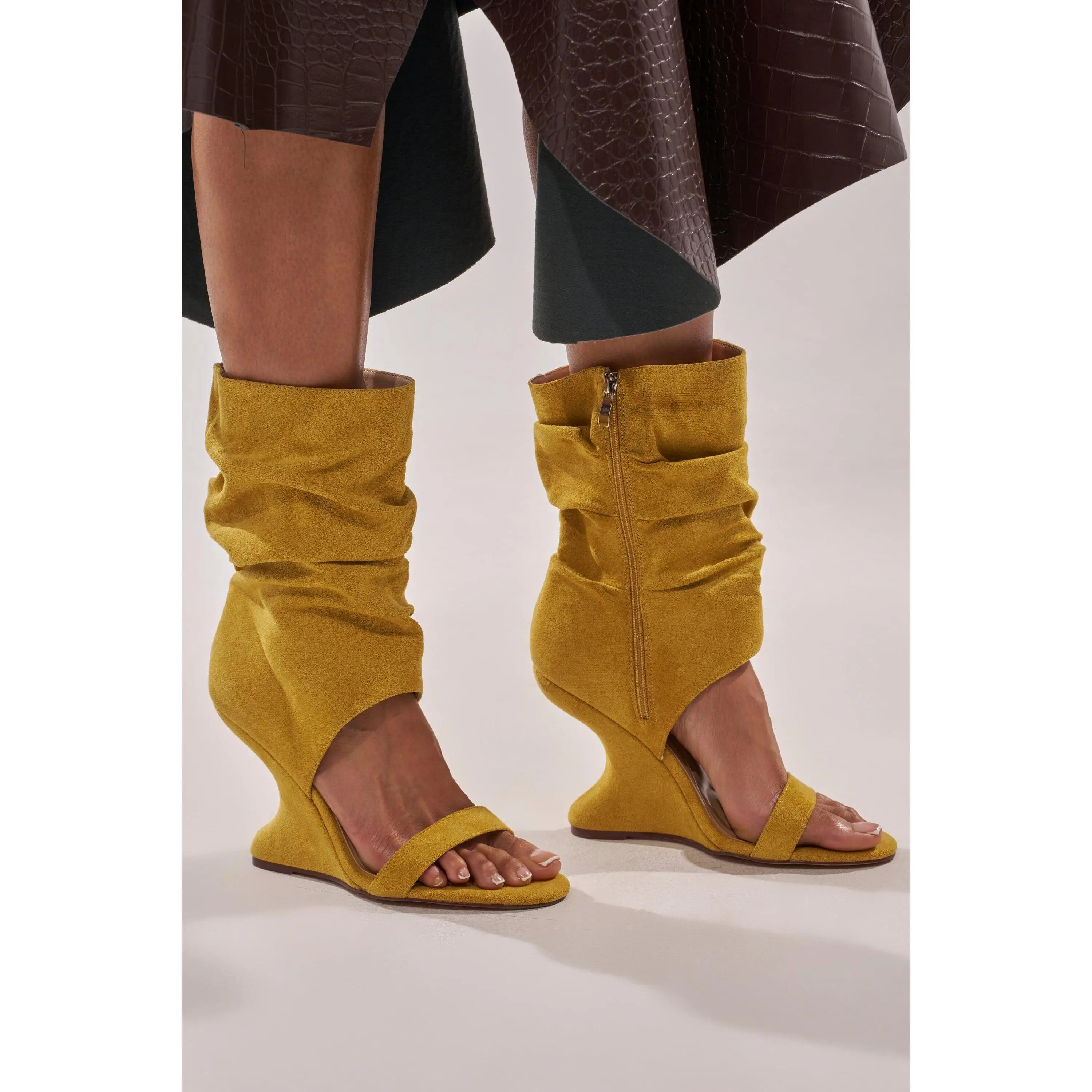 Azalea Wang Kyvelisa Mustard Wedge Open Toe Bootie @AKIRA #tiktokshopcreatorpicks #TikTokShopStockUp #kneehighboots #chelseaboots #squaretoeboots