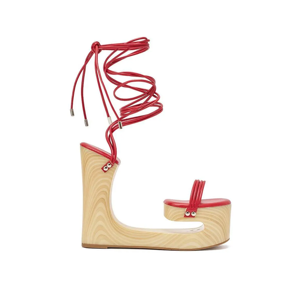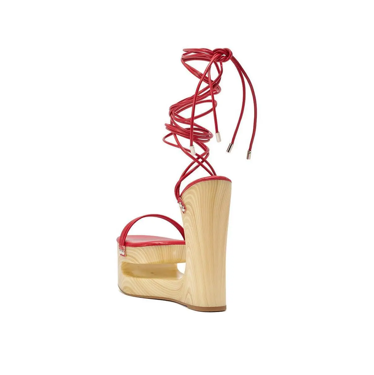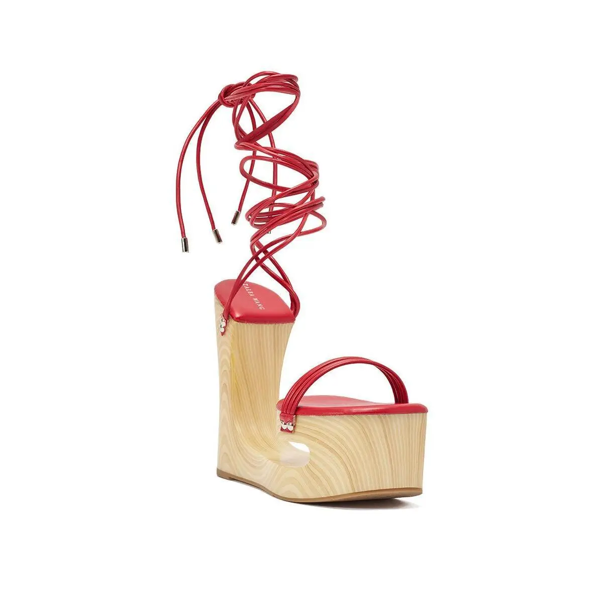 Statement-making red lace-up platform wedge sandal with a faux woodgrain finish, perfect for date nights, rooftop drinks, or a standout vacation look. Featuring a sleek open-toe silhouette with minimal strap detailing and long wraparound lace-up ties, this bold wedge brings a pop of color with a fashion-forward sculptural shape. The dramatic platform wedge gives you that leg-lengthening lift while staying stable. Pair with denim, a mini dress, or a matching set for a high-impact outfit.- Faux Leather Upper- Square Open Toe- Wedge Heel- Platform Sole- Imported(all measurements approximate from size 7.5)- 6.25” Heel Height- 2.5” Sole- 31.5” Ties (each)Product ID: 1081312