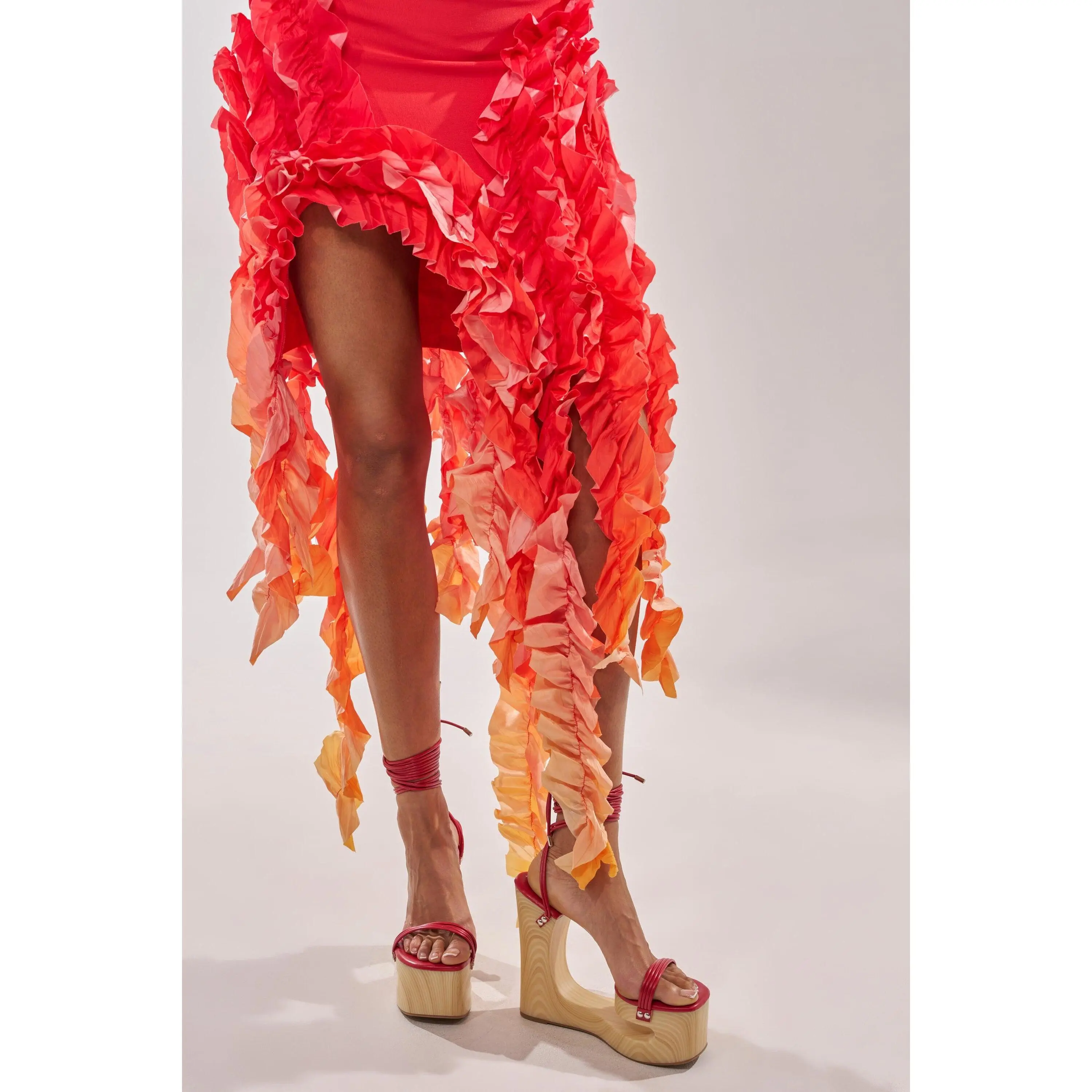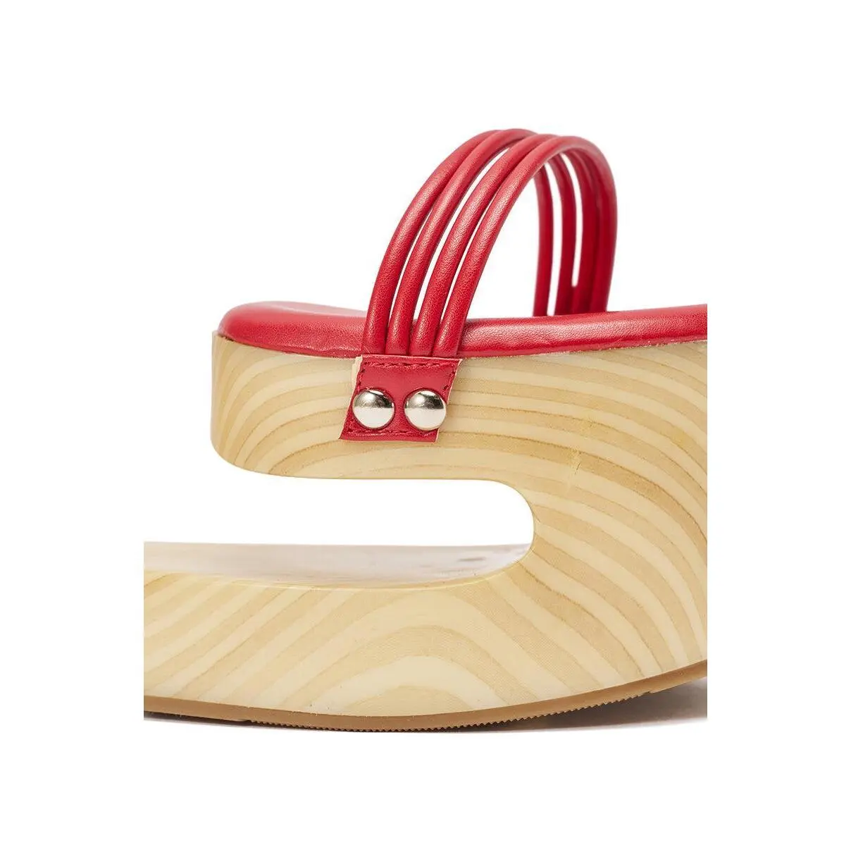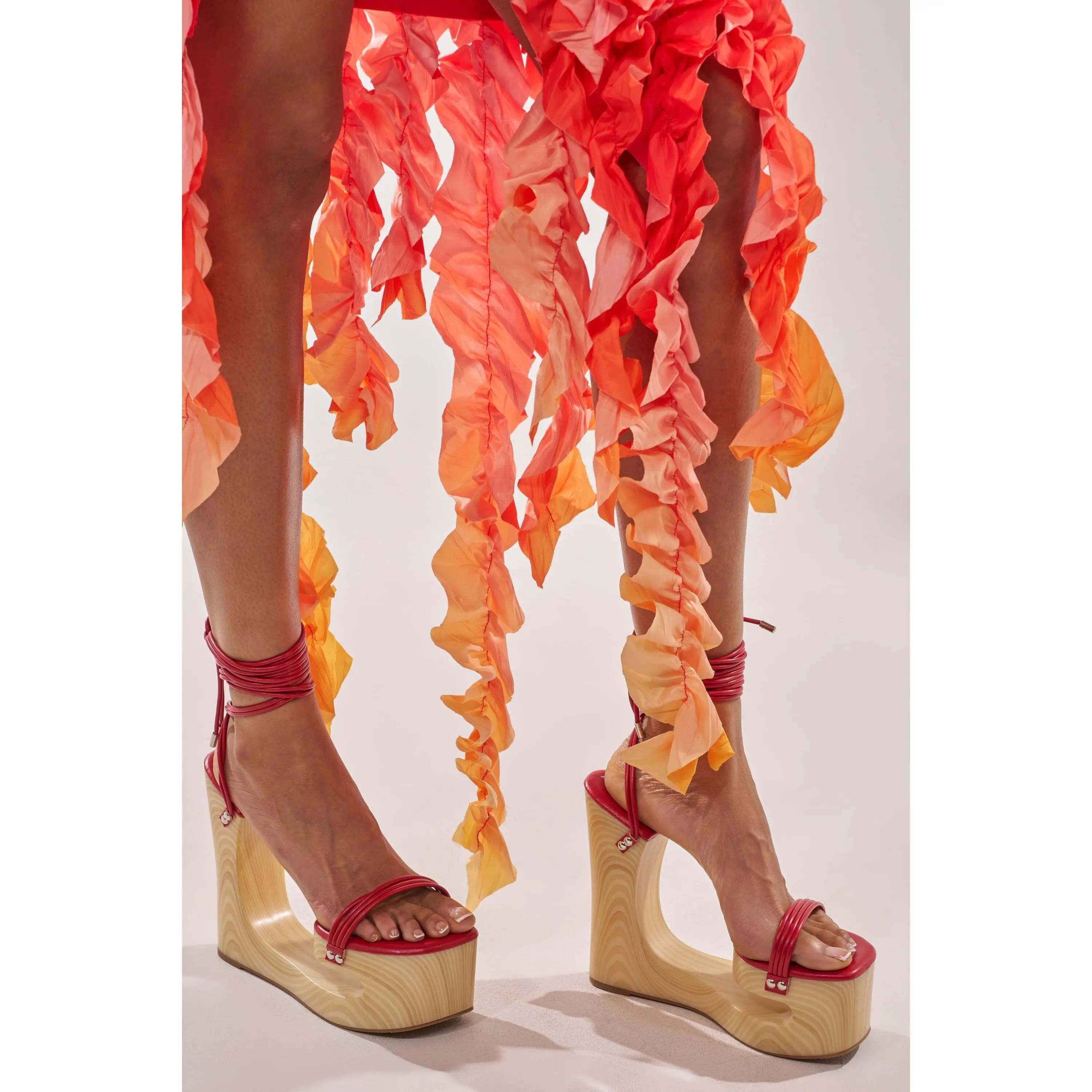 Statement-making red lace-up platform wedge sandal with a faux woodgrain finish, perfect for date nights, rooftop drinks, or a standout vacation look. Featuring a sleek open-toe silhouette with minimal strap detailing and long wraparound lace-up ties, this bold wedge brings a pop of color with a fashion-forward sculptural shape. The dramatic platform wedge gives you that leg-lengthening lift while staying stable. Pair with denim, a mini dress, or a matching set for a high-impact outfit.- Faux Leather Upper- Square Open Toe- Wedge Heel- Platform Sole- Imported(all measurements approximate from size 7.5)- 6.25” Heel Height- 2.5” Sole- 31.5” Ties (each)Product ID: 1081312