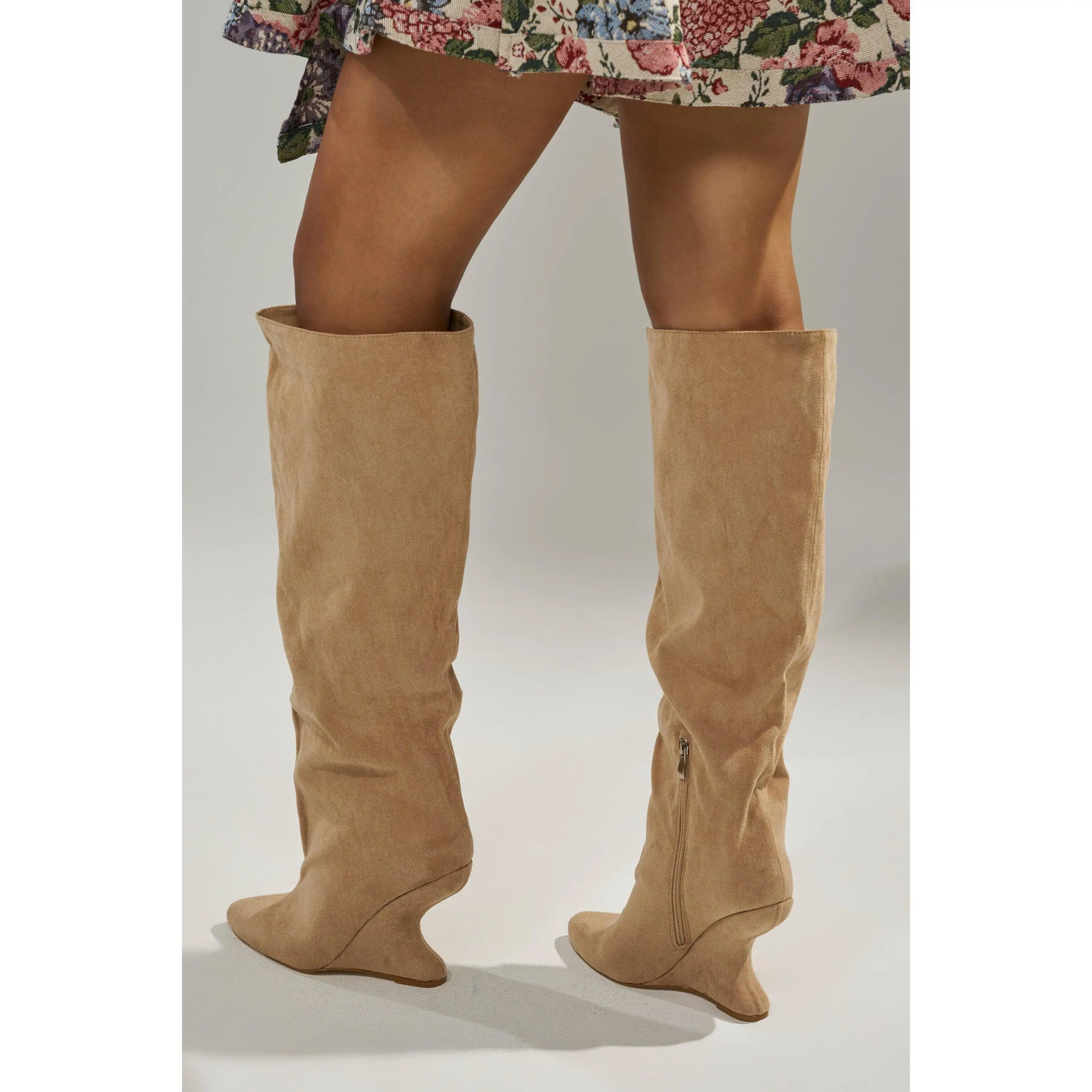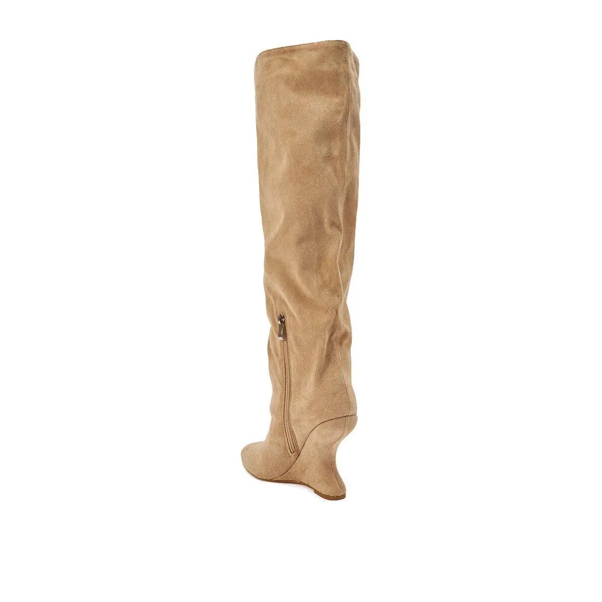 Have a minimalist moment in The AZALEA WANG Vince Nude Faux Suede Wedge Boot. These knee-high boots are crafted from soft, supple faux suede and feature a pointed toe, a uniquely sculpted inverted wedge heel, and an inner-ankle zipper closure.- Faux Suede Upper- Pointed Toe- Inverted Wedge Heel- Knee-High Shaft- No Stretch- Imported(all measurements approximate from size 7.5)- 4.5” Heel Height- 18” Shaft Height- 20” Shaft Opening Circumference- 12” Calf CircumferenceProduct ID: 1087857