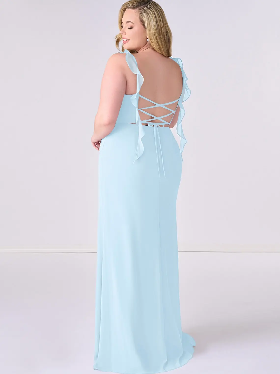 This floor-length dress boasts a sweetheart neckline and ruffle straps. It features pleating, a keyhole back, and a leg slit. The dress is made of non-stretch chiffon fabric. It has a mermaid silhouette and is sleeveless. The back style includes a zip, strap detail, and a bow/tie back.