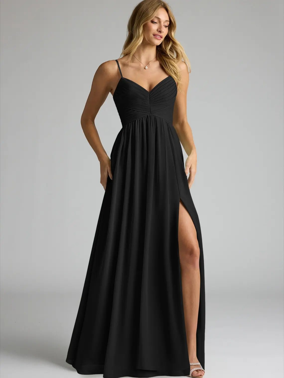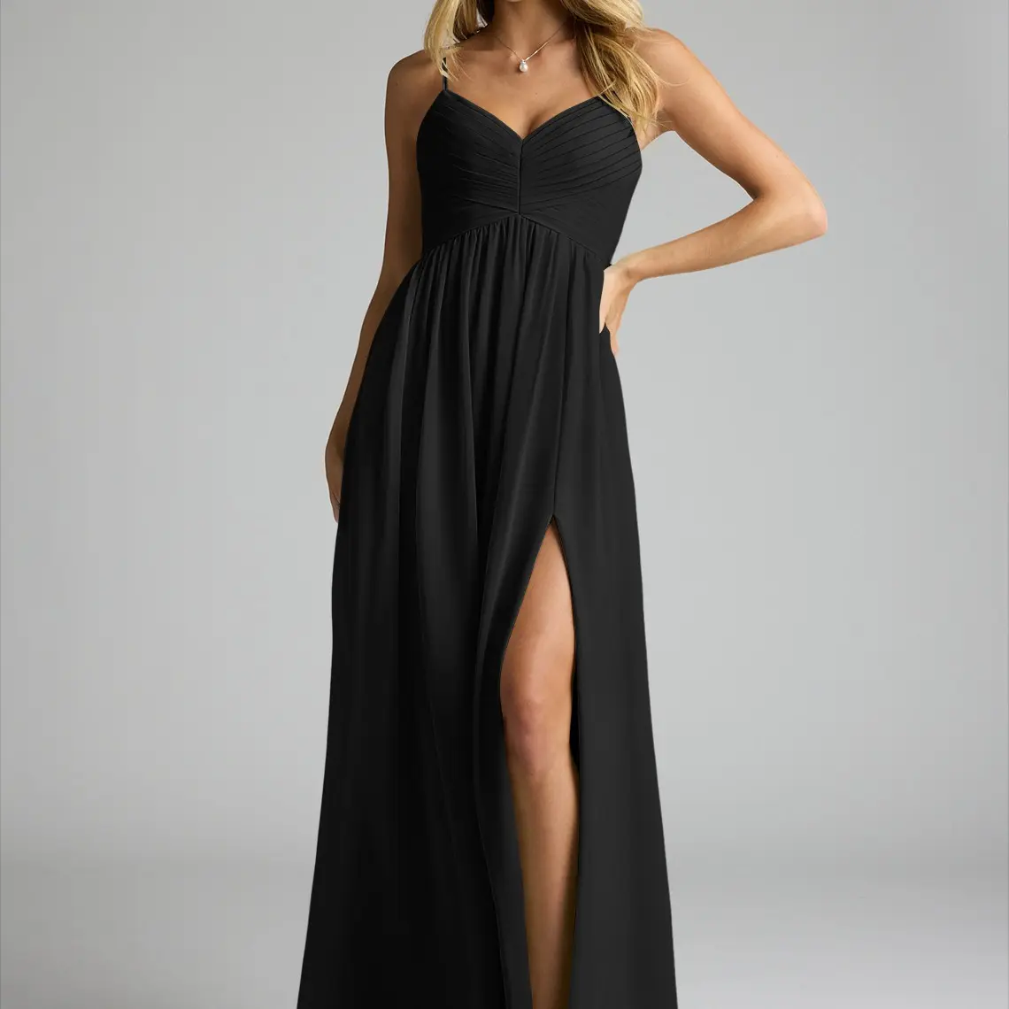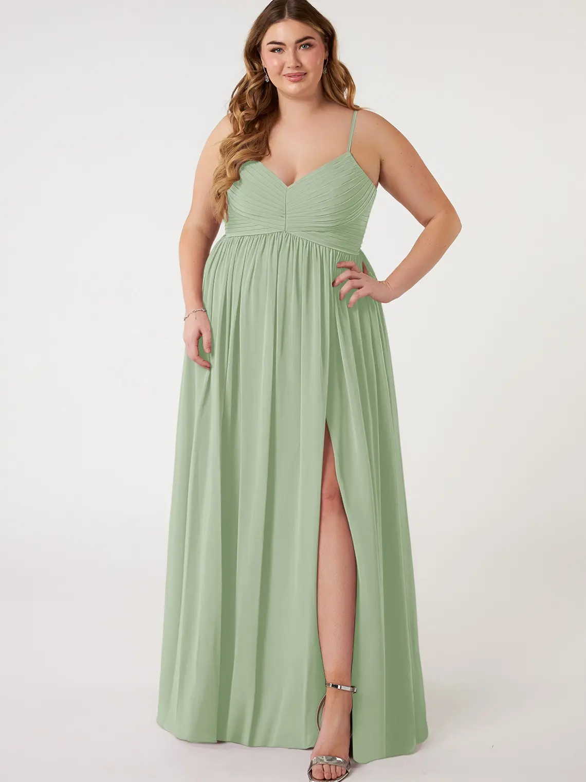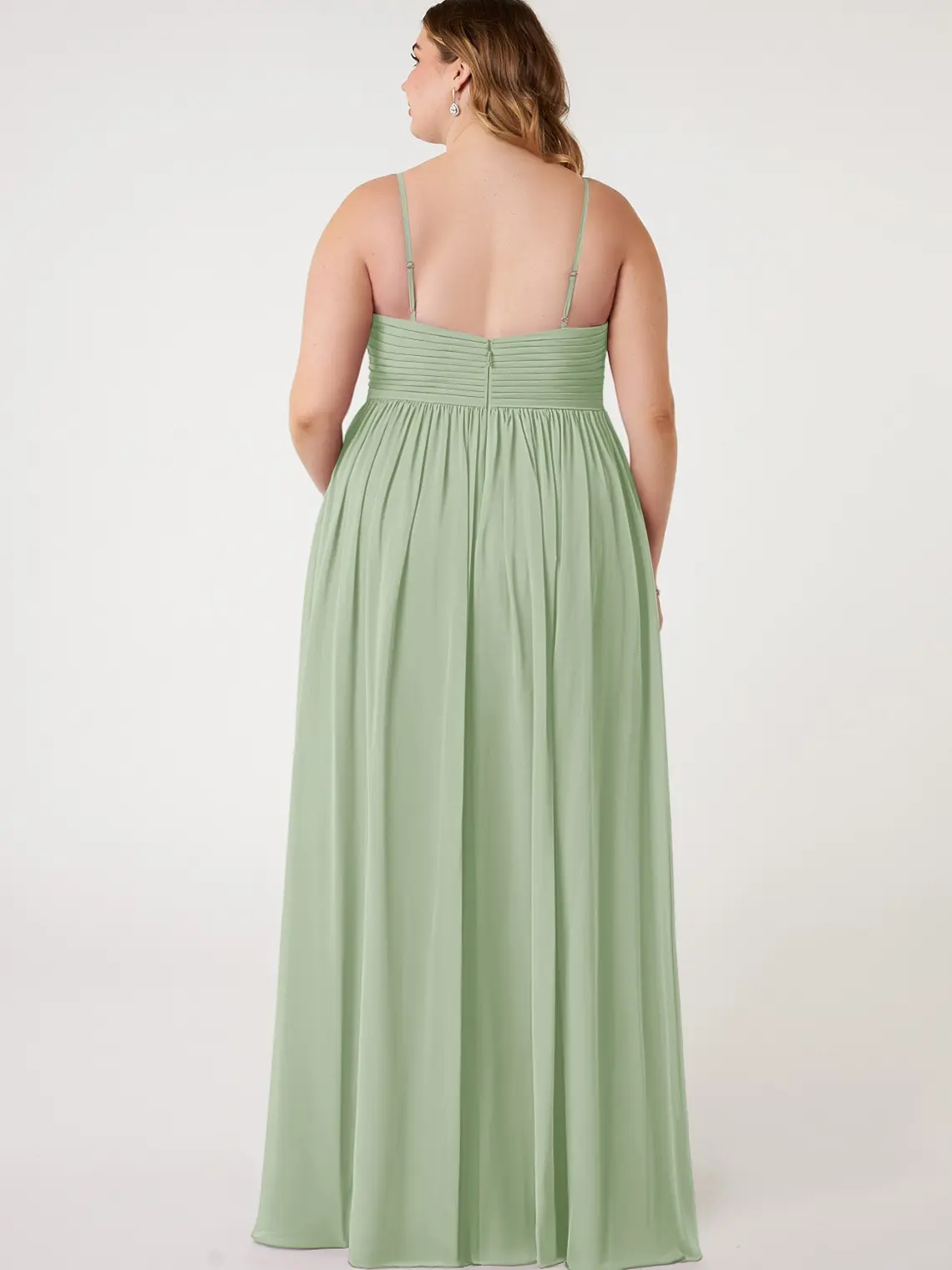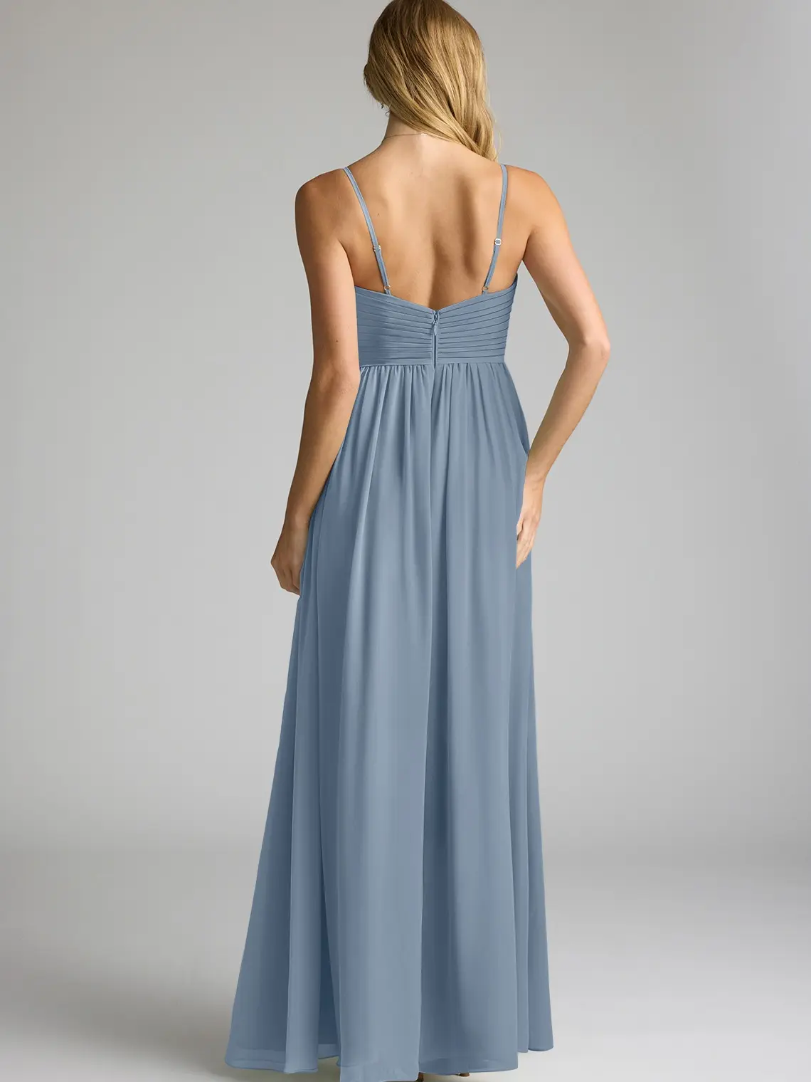 Alia is our chiffon bridesmaid dress, perfect for your bridesmaids. It features a delicately pleated V-neckline held by adjustable spaghetti straps. The front waist is an empire seam, sitting atop a flowy gathered A-line skirt with a front side slit. 🌸