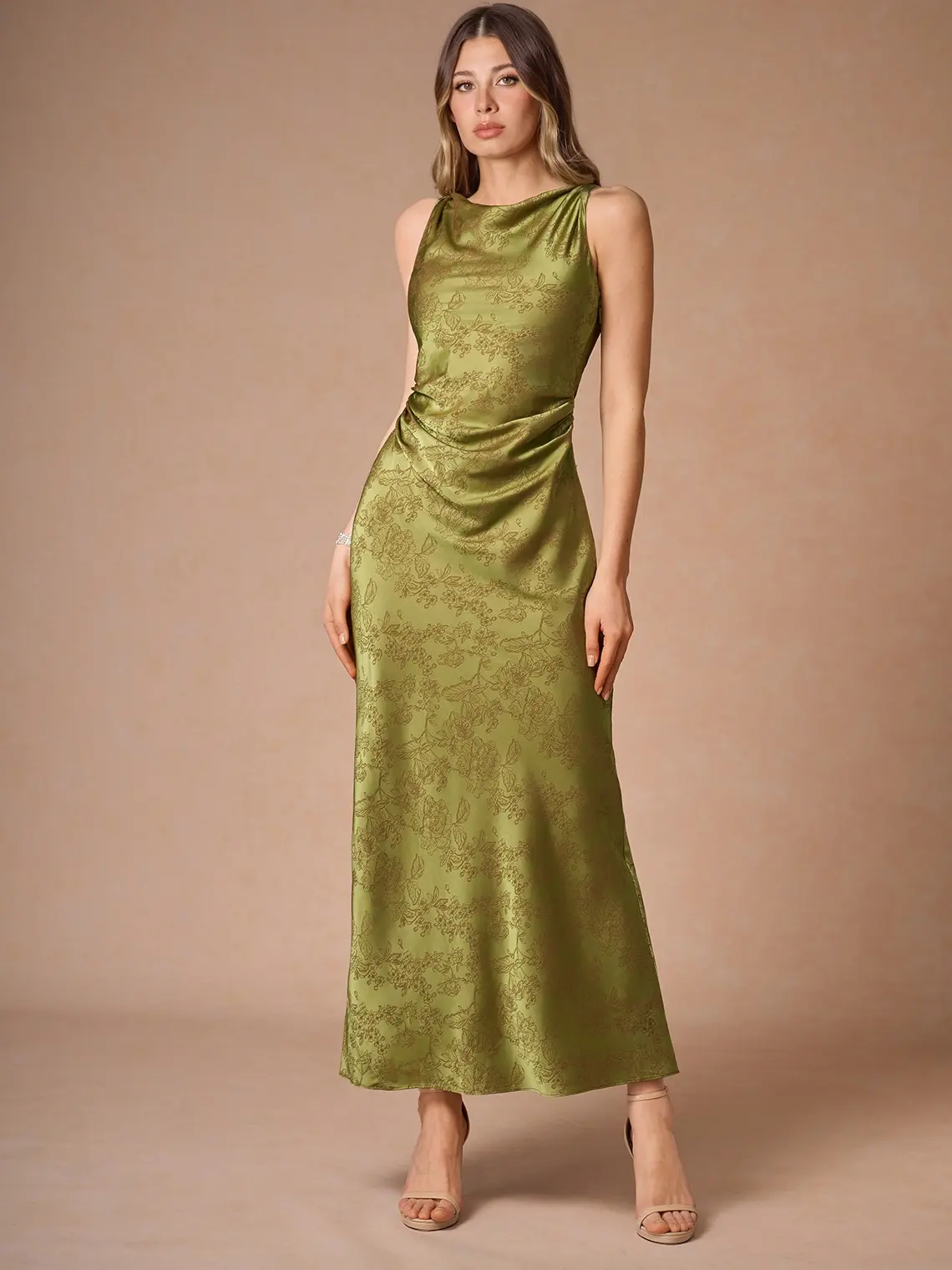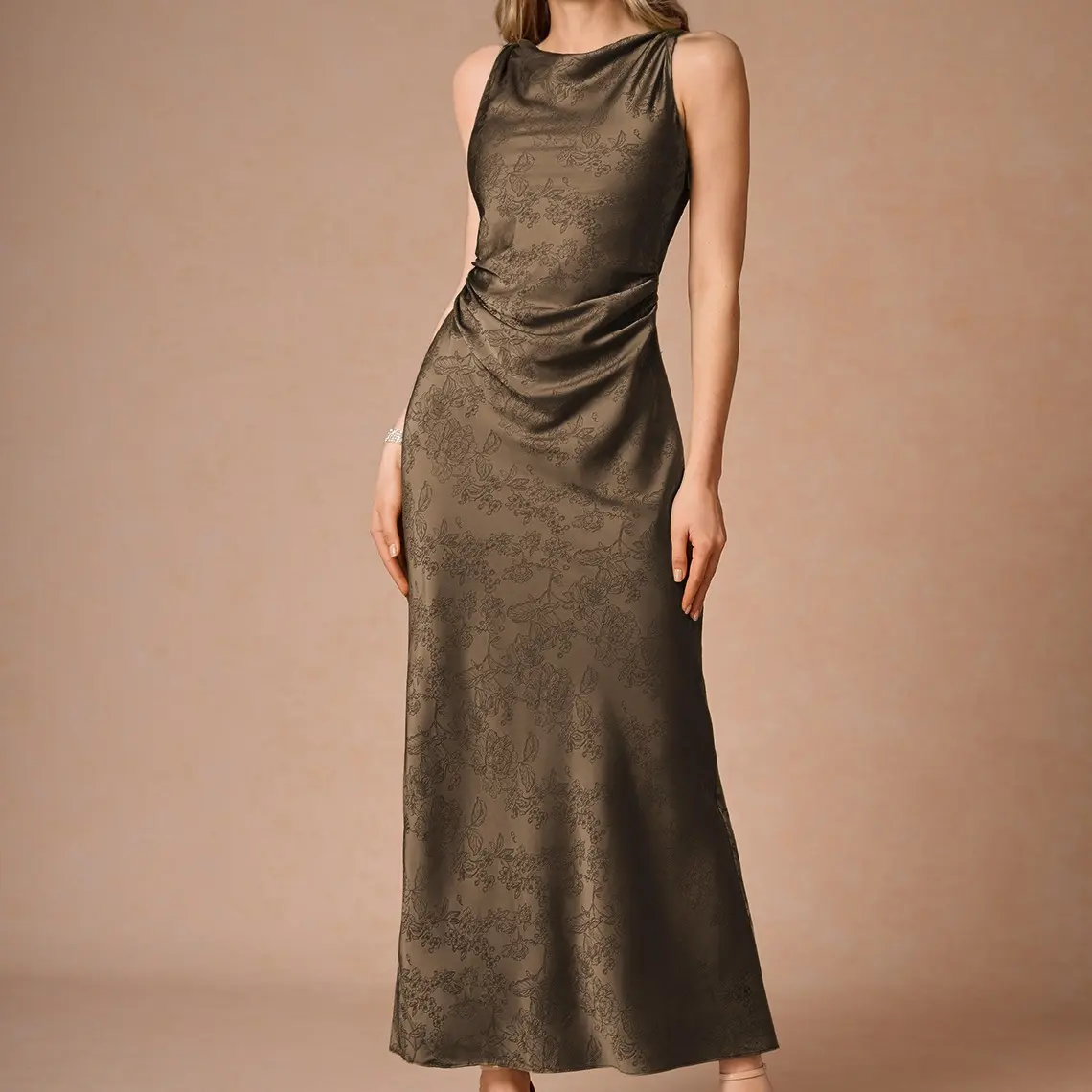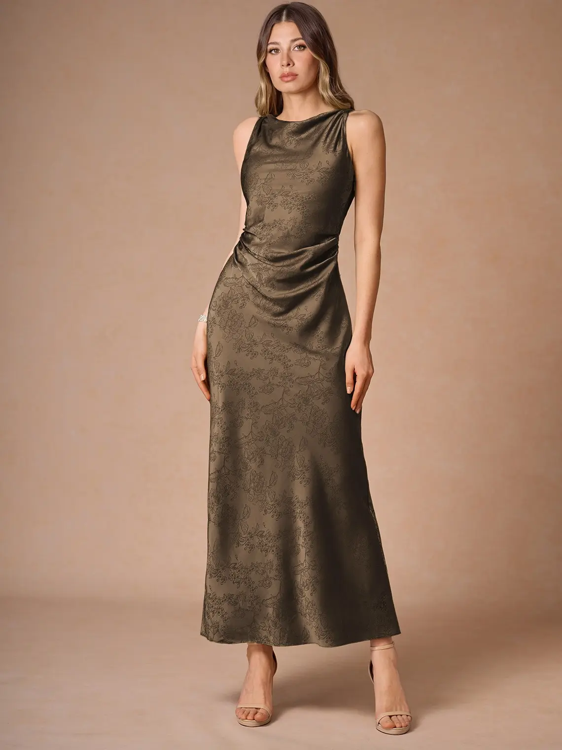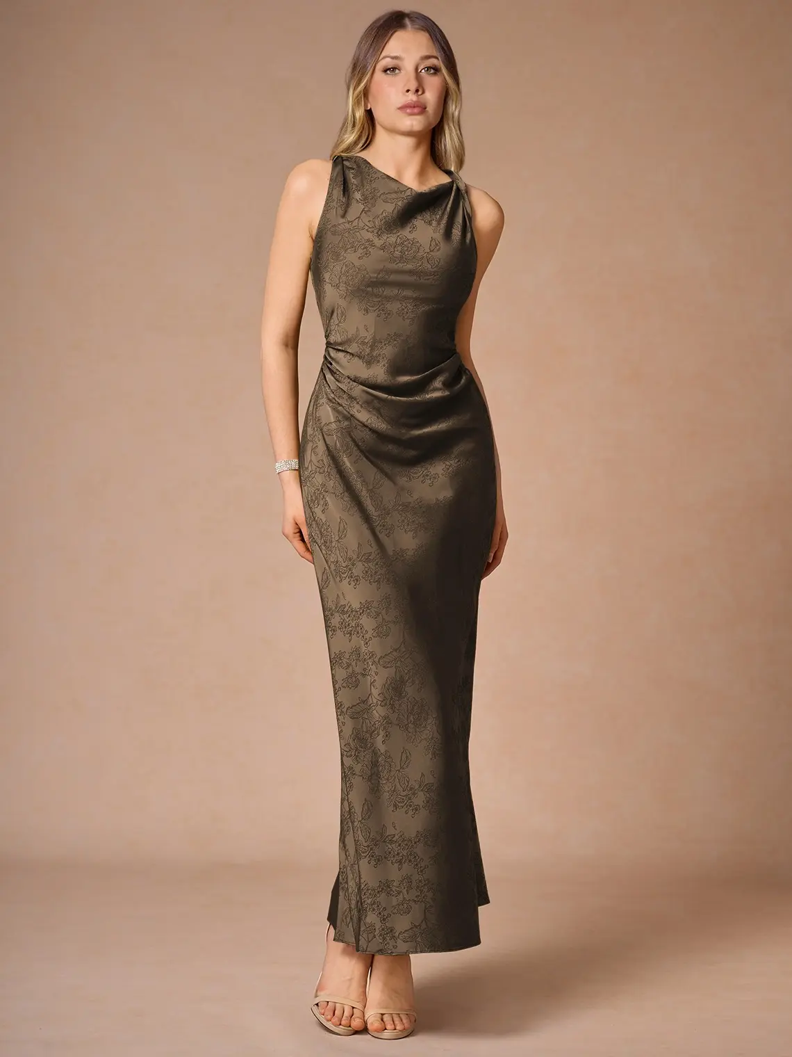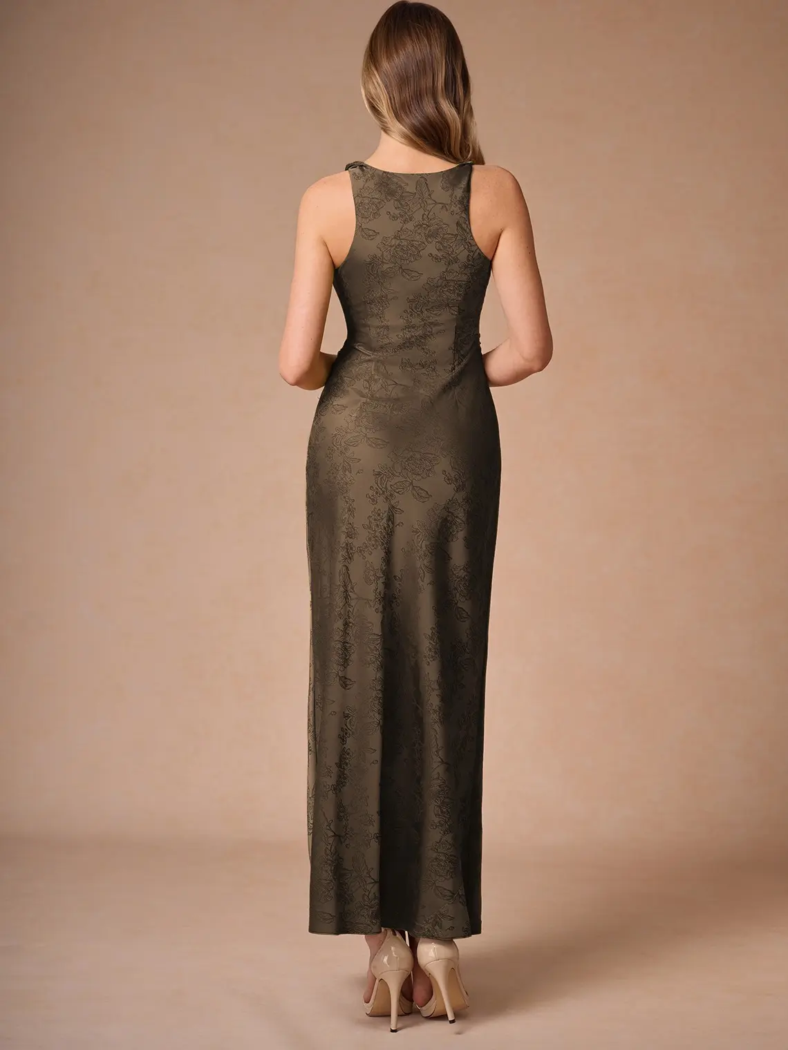 The Elena Maxi Dress by Azazie Atelier is a floral jacquard style. It features a twist detail at the neckline and an ankle-length sheath skirt. Perfect for your next special event, this dress combines elegance with style. • Floral jacquard • Lined bust • Hidden side zipper.