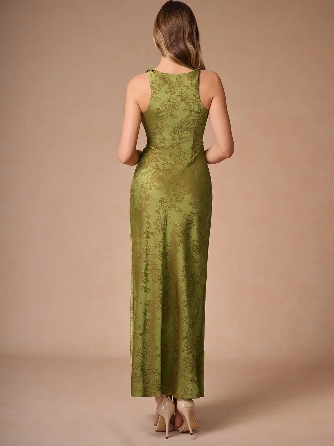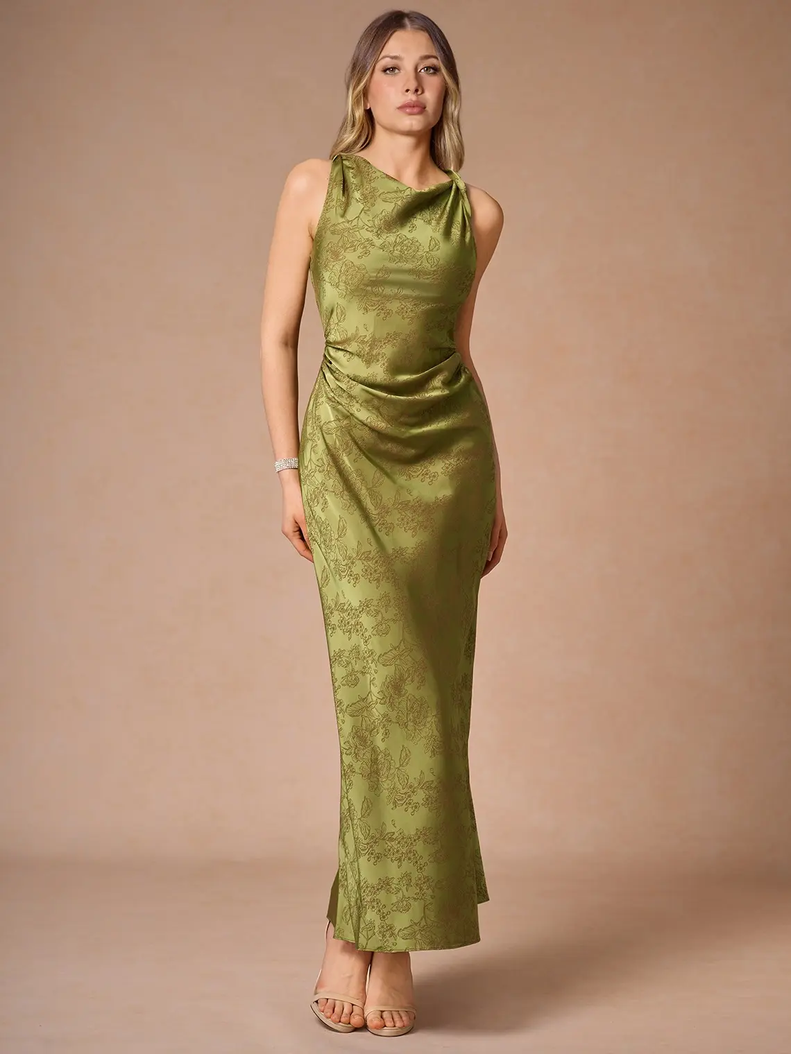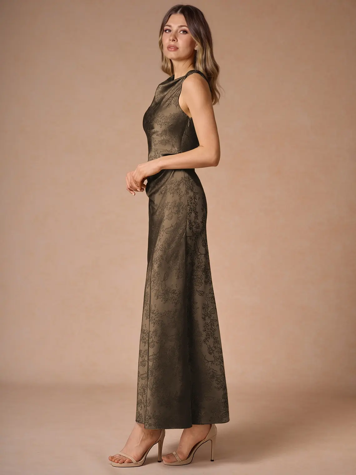 5. Azazie Elena Sheath Twist-Neck Floral-Jacquard Wedding Guest Evening Maxi Dress