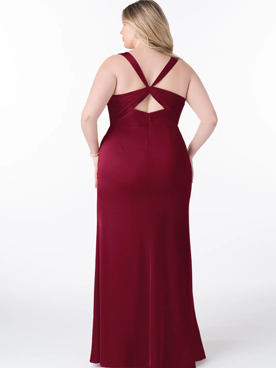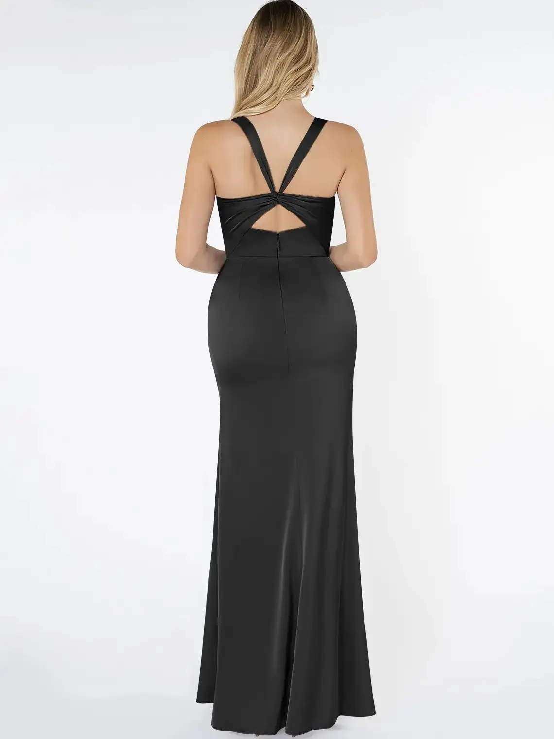 The back is a true statement feature, combining a refined keyhole design with a soft V-back and delicate button detailing, creating visual interest from every angle. The gown’s mermaid silhouette flows seamlessly into a pleated, floor-length sheath skirt, elongating the figure and creating a graceful, statuesque effect. A subtle leg slit adds both movement and allure, allowing the dress to glide effortlessly with each step while adding a touch of modern sensuality.