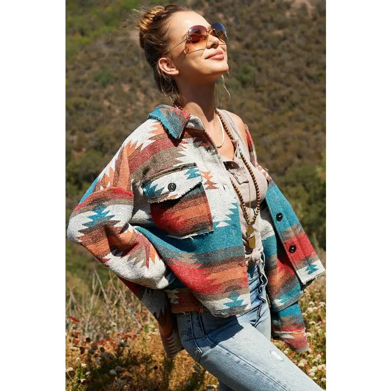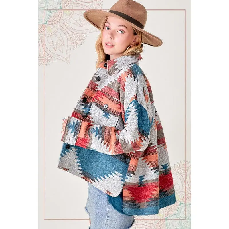 Functional yet fashionable aztec jacket ! We've given the jacket a slightly cropped body and an aztec print all over for an unique look. Made of lightweight soft brushed fabric, featuring a collared neckline and long sleeves with dual patch pockets, button-down closure, high-low hem. Boxy, cropped bodice ends in a distressed, raw hem that wraps around to a concave.