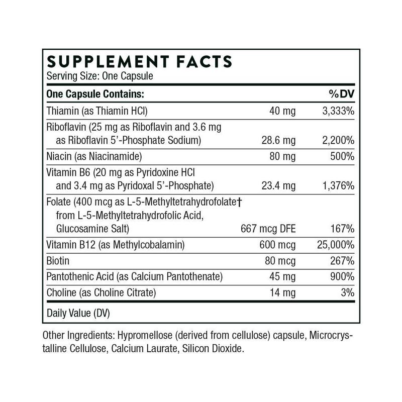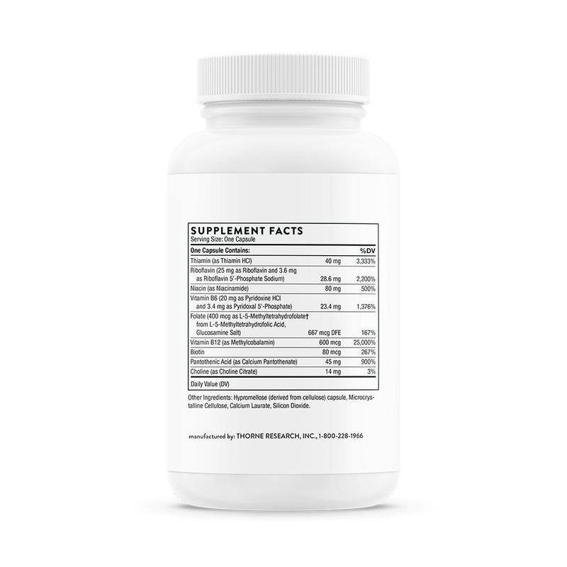 Thorne's B-Complex #12 supplies the active form of vitamin B12 – methylcobalamin – as well as the active form of folate – 5-MTHF. The other bioactive forms of the B vitamins in each capsule ensures you will get the most bioavailable vitamin B complex available.* B-Complex #12 is not derived from yeast.