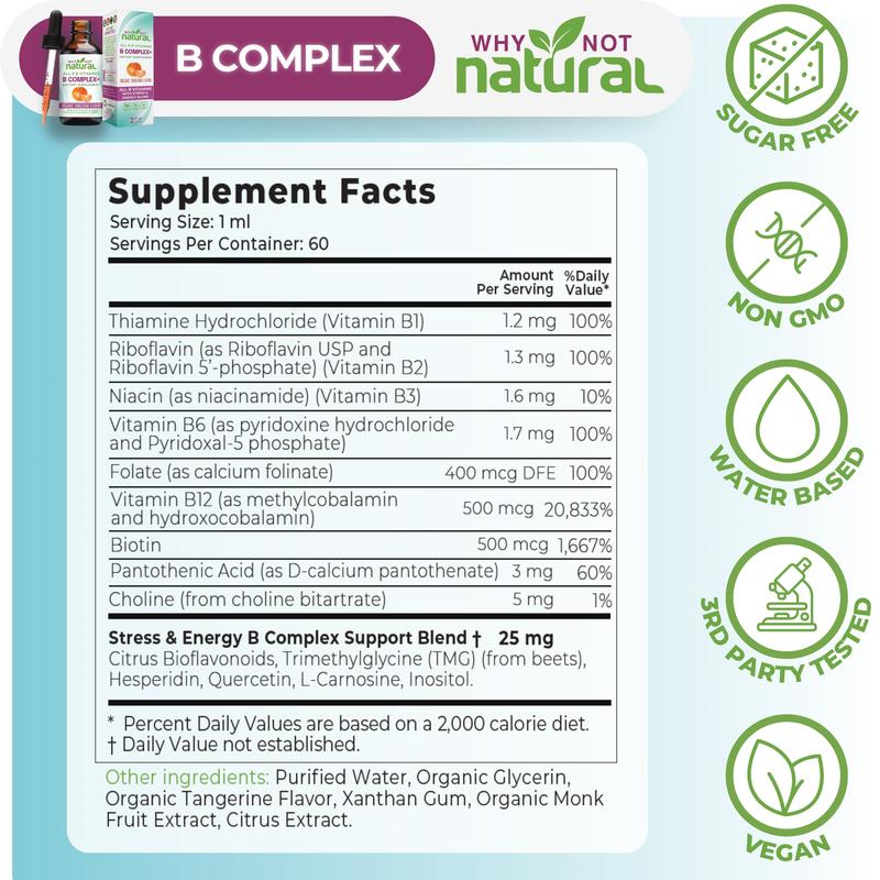 Complete B Complex: Contains ALL 8 B Vitamins, B1 B2 B3 B5 B6 Biotin (B7) Folate (B9) and cobalamin, in their bioavailable forms. Most B complex liquid supplements contain only some of the B vitamins or cheap inactive forms! You'll feel the difference.