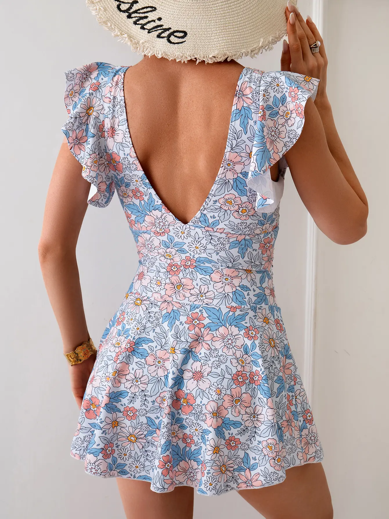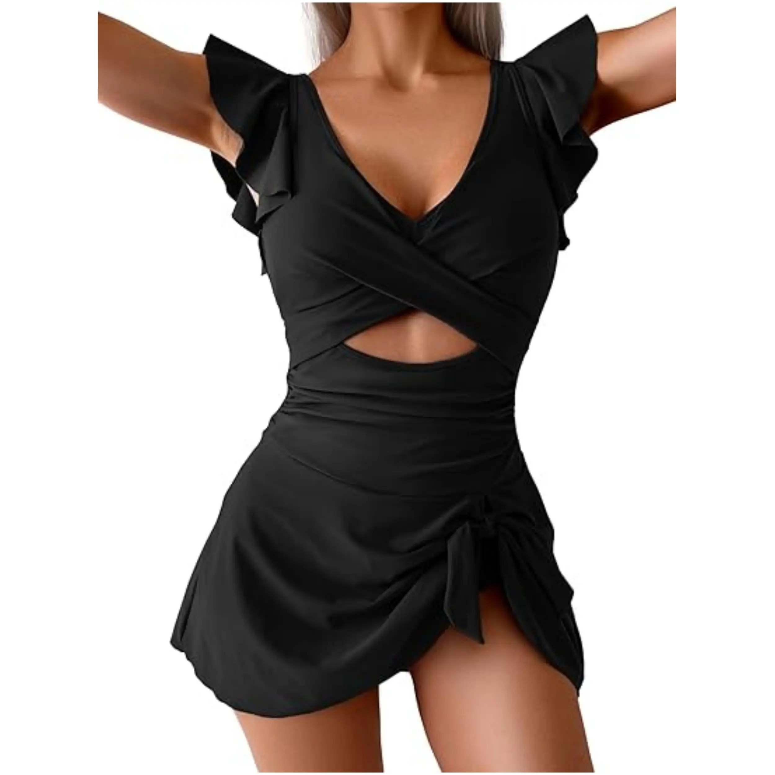【Criss cross one piece swim suits】 Removable bra pads and front cross design add bust supports and push up bust. Ruffle sleeve makes arms look more slender and slimmer, making you look more elegant