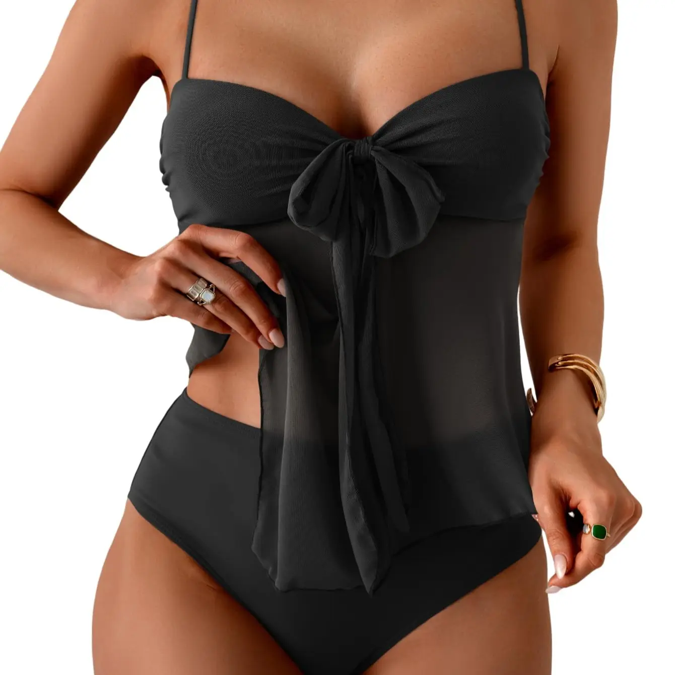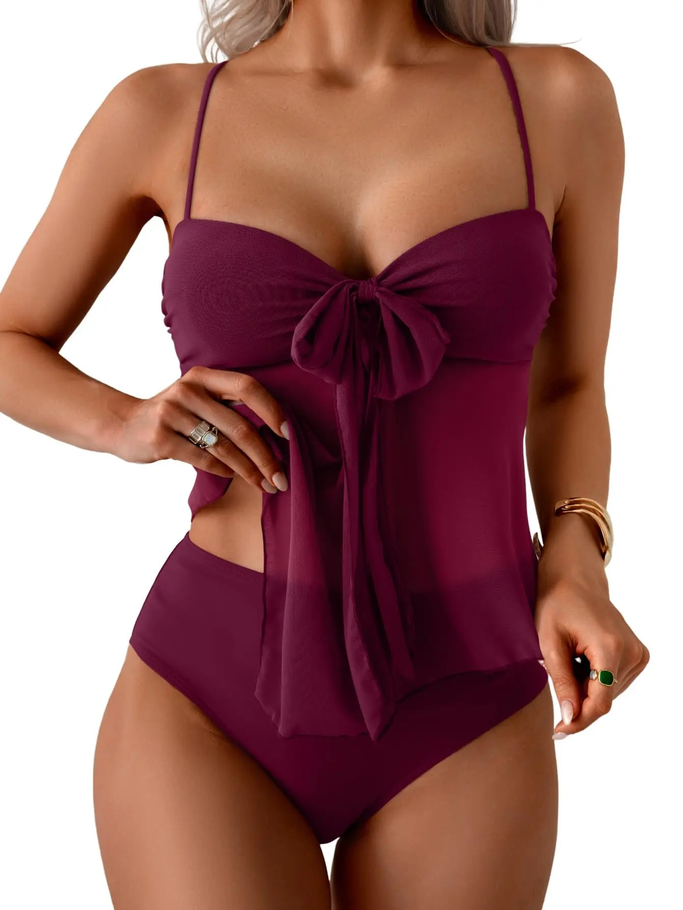 ·[ONE TIE & TWO STYLES] Features a convertible front tie that switches from a sweet bow knot to a supportive halter neck. This versatile design adapts seamlessly from family pool days to chic resort lounging giving you two distinct looks in one suit.