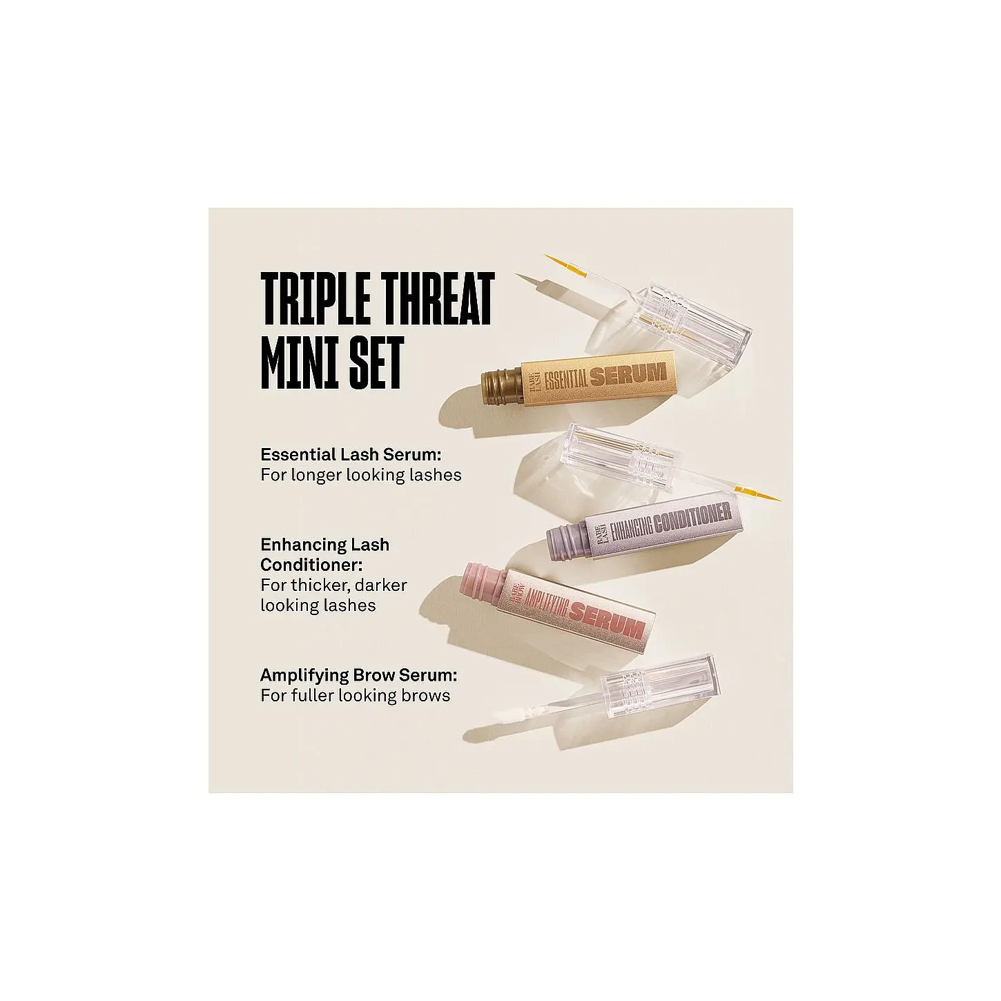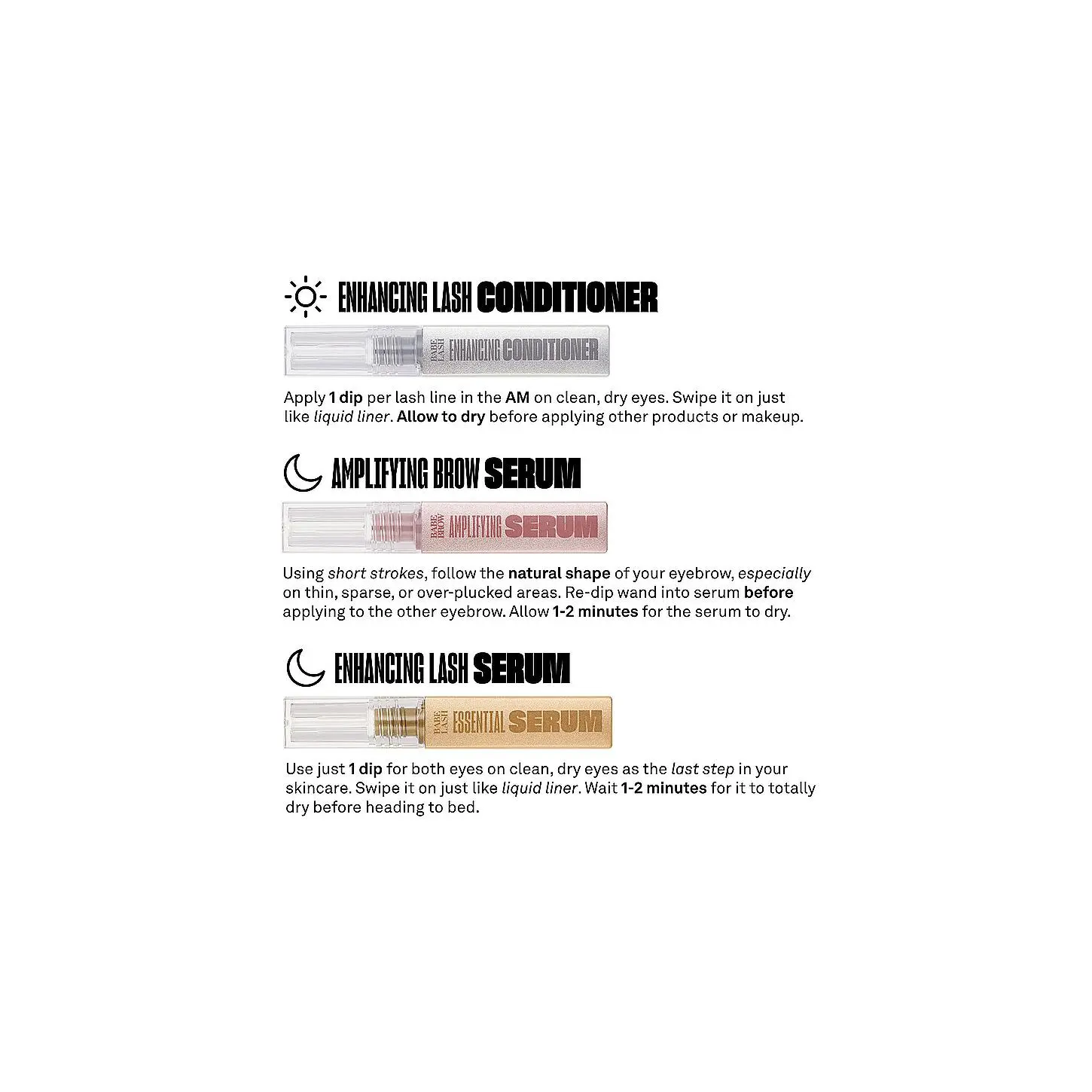 ·Kit includes the Essential Serum 1mL, Enhancing Conditioner 1mL, and the Amplifying Brow Serum 1mL.