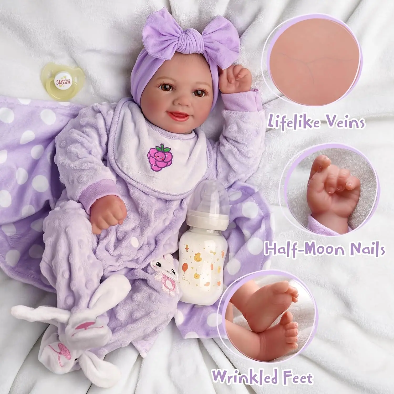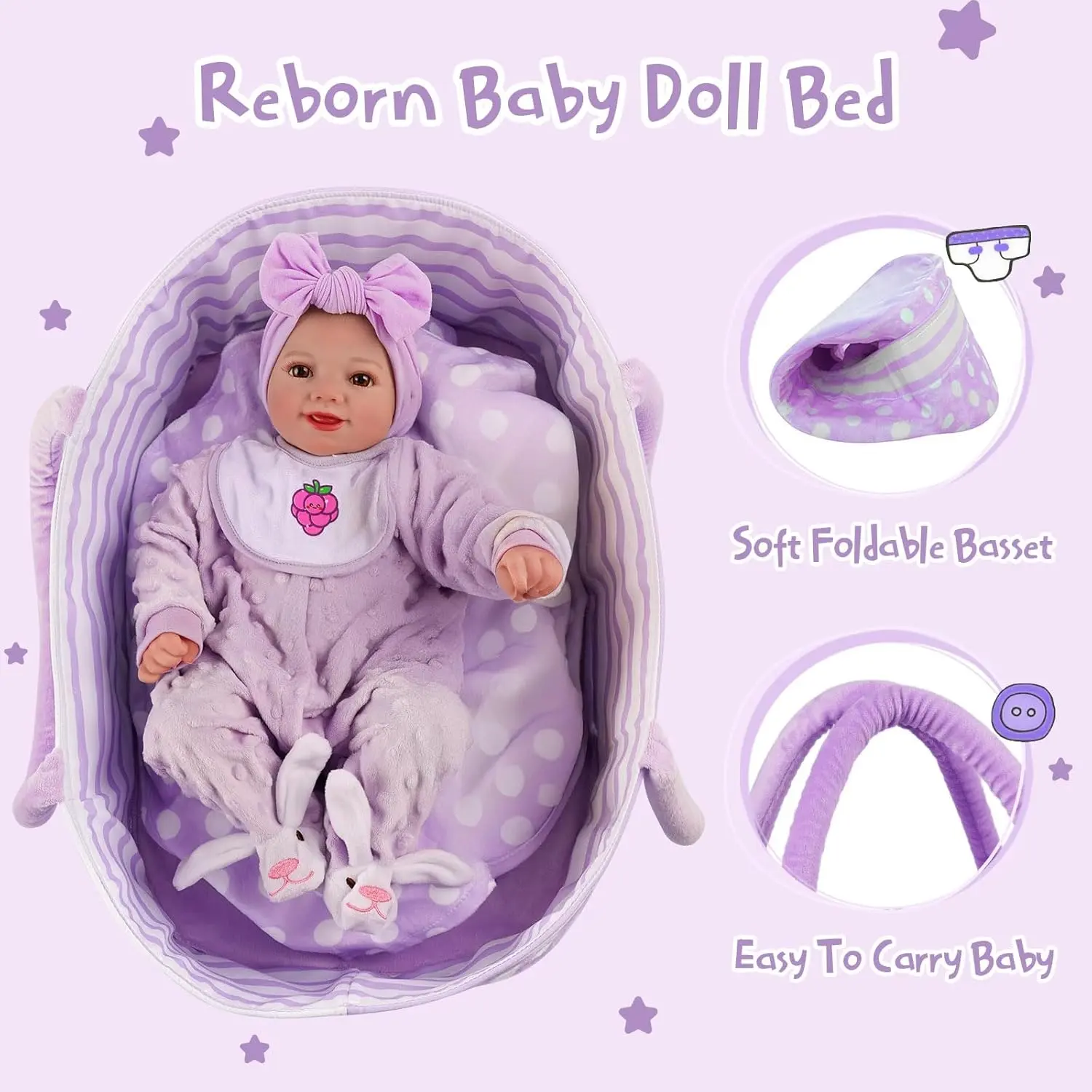 The image shows the reborn baby doll with its accessories. The doll is 17 inches tall, with a fabric body and vinyl limbs. 📸