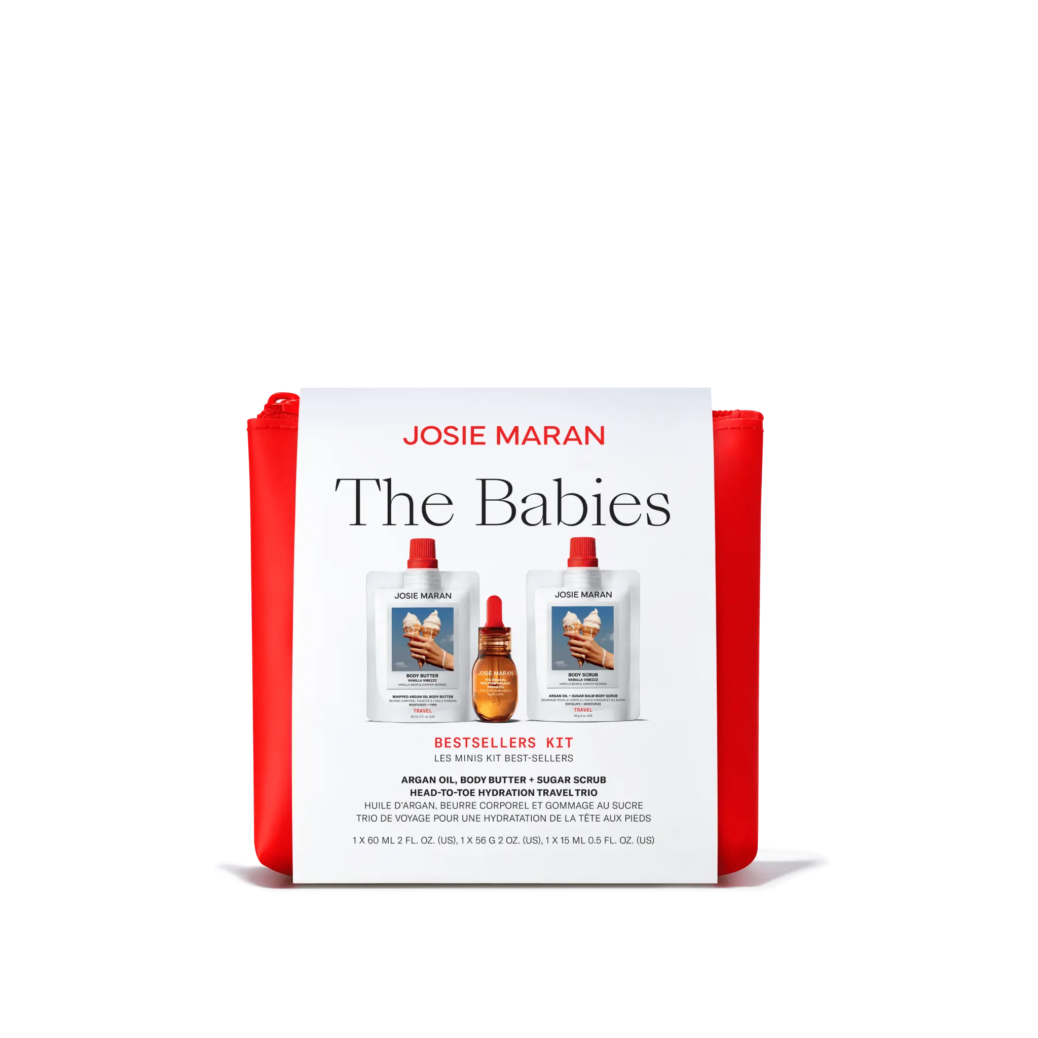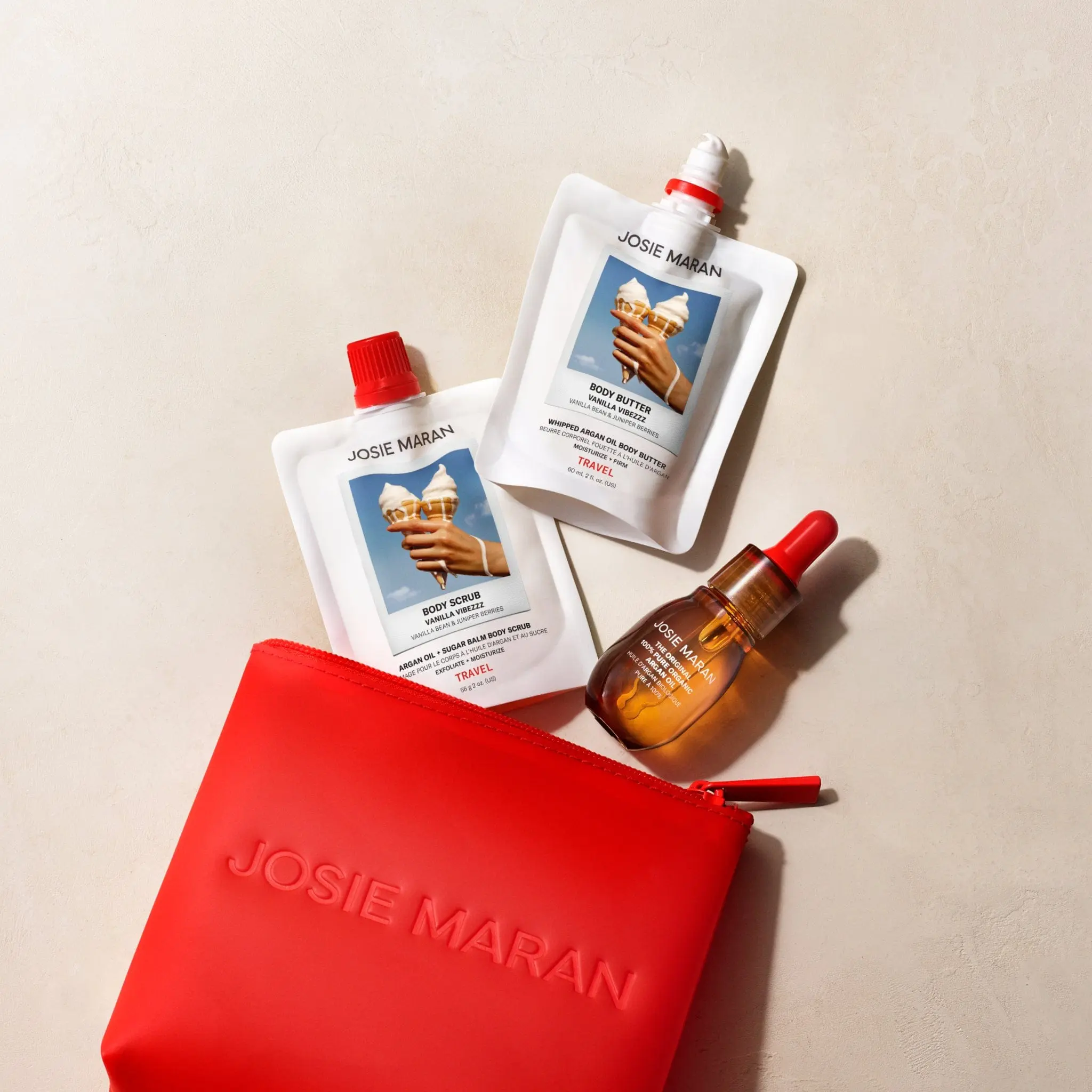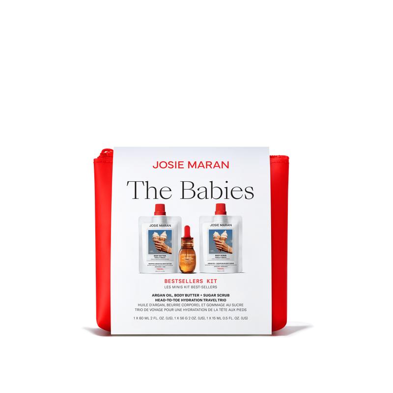 A travel trio of Josie’s hair-to-toe Argan Oil—plus a firming Body Butter and smoothing Sugar Scrub in Vanilla Vibezzz.