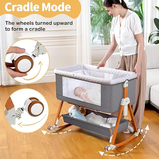 5. Baby Bassinet Sleeper, 6 Height Adjustable Cribs, Easy to Fold Portable Crib Side Bassinet, Swing Cradle Bed Side Sleeper with Ventilated Net&Wheels