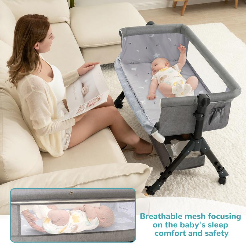·SAFETY AND STABILITY: Bedside sleeper features a sturdy triangular structure and an extra wide bottom bracket, making our baby bed more stable and level. The double-sided mesh design maximizes breathability and airflow, ensuring your baby sleeps safely and comfortably. It also allows parents to keep an eye on the baby at all times.