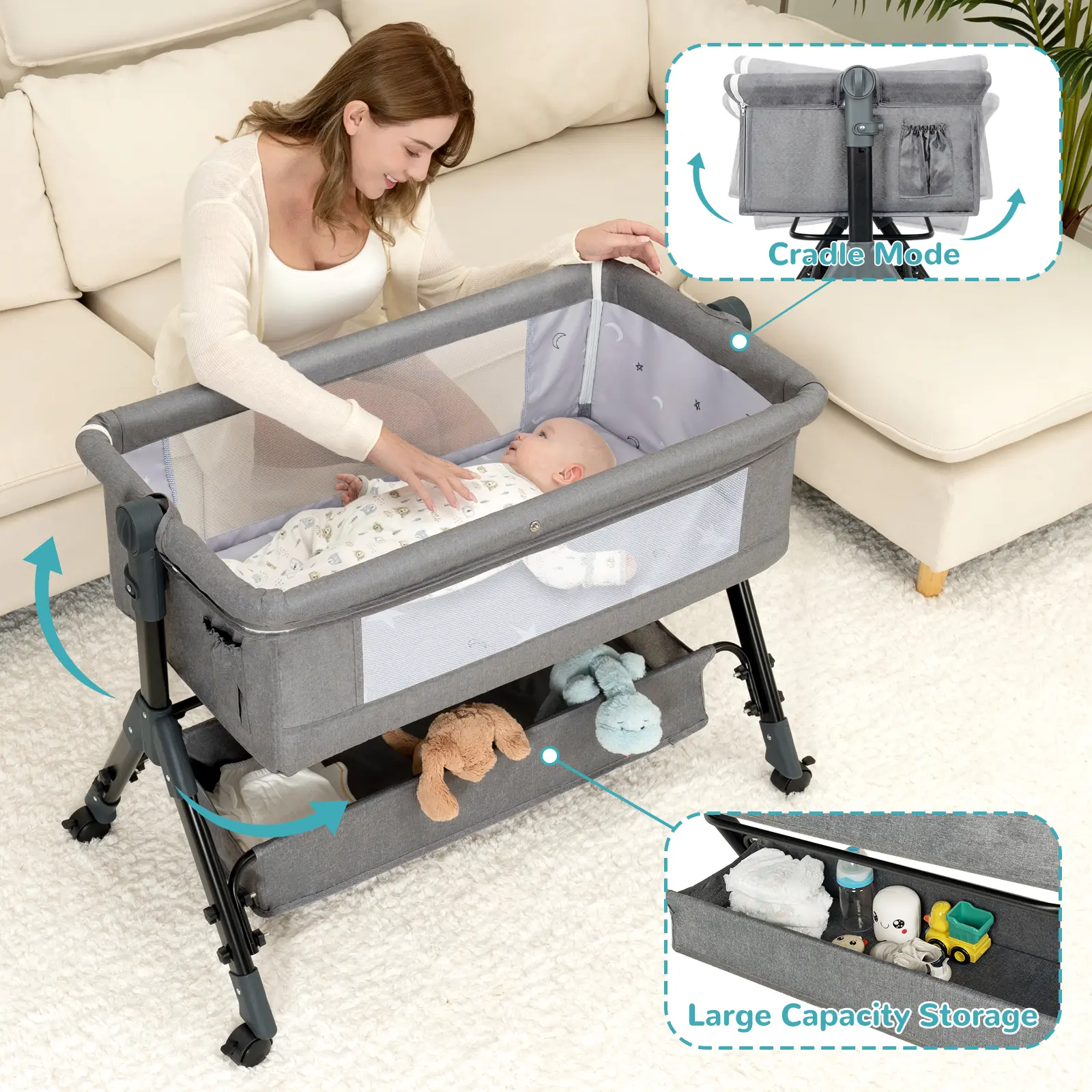 ·MAKE PARENTING EASIER: Our baby bassinet is equipped with four silent wheels with brakes for easy movement, and an integrated mosquito net to prevent insects from entering. The mattress has a moderate hardness, making the baby feel comfortable.It also features a large storage basket for baby essentials.Product Dimension: 36.22"Lx21.65"Wx31.88"H