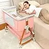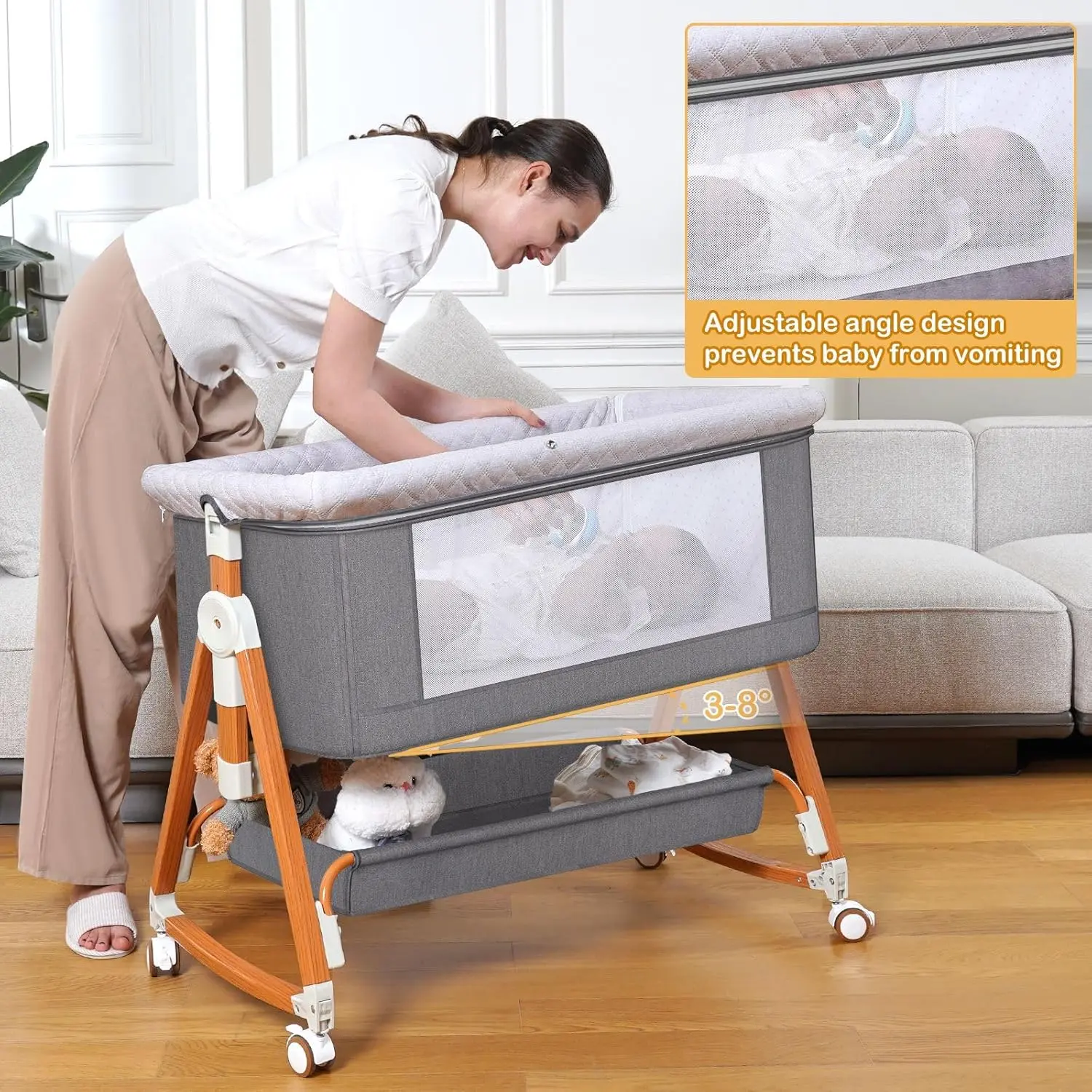 ·MAKE PARENTING EASIER: Our baby bassinet is equipped with four silent wheels with brakes for easy movement, and an integrated mosquito net to prevent insects from entering. The mattress has a moderate hardness, making the baby feel comfortable.It also features a large storage basket for baby essentials.