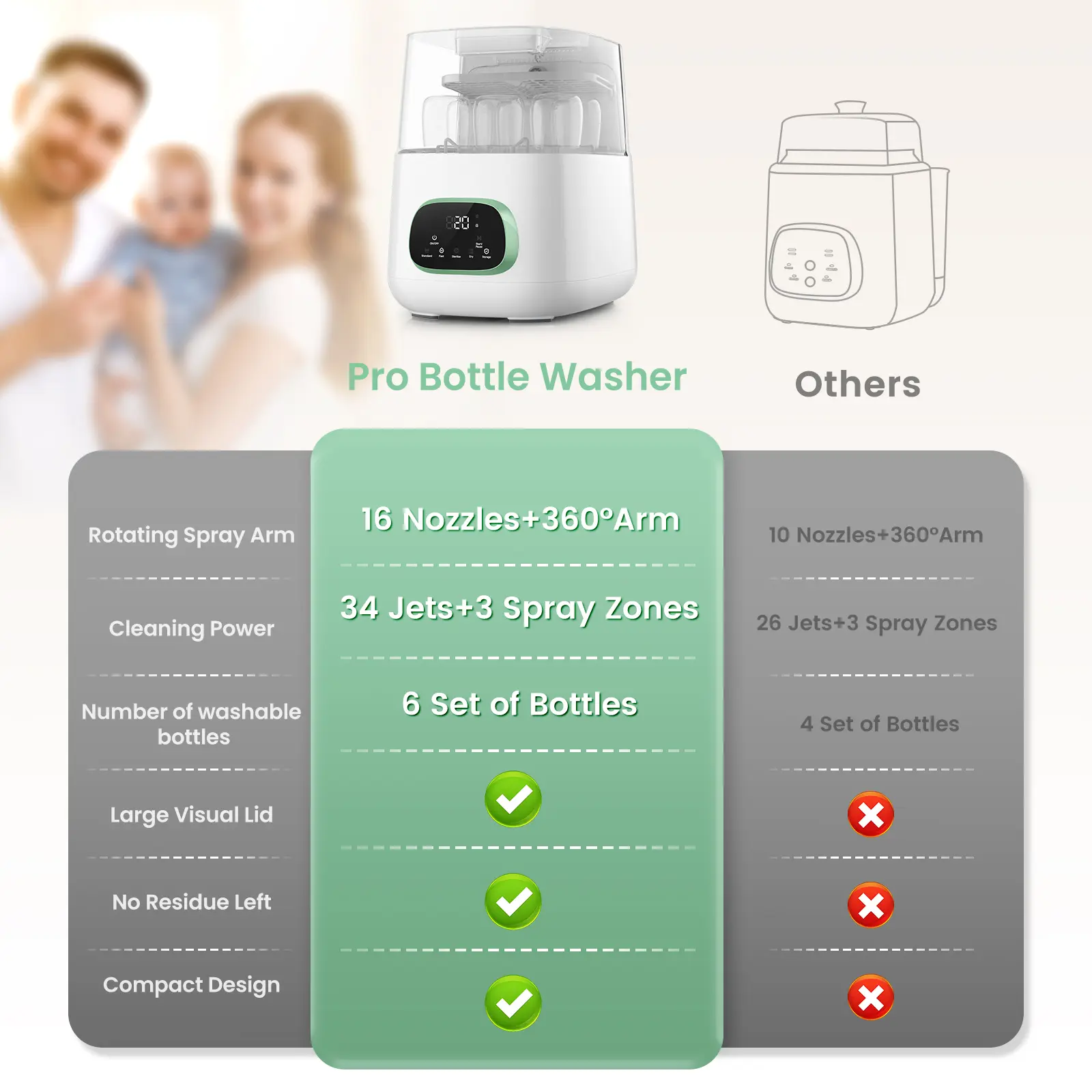 Equipped with 34 powerful spray jets (18 directional + 16 swirling) to clean inside and outside thoroughly. Comes with 60 detergent tablets to ensure no stains or odors remain.