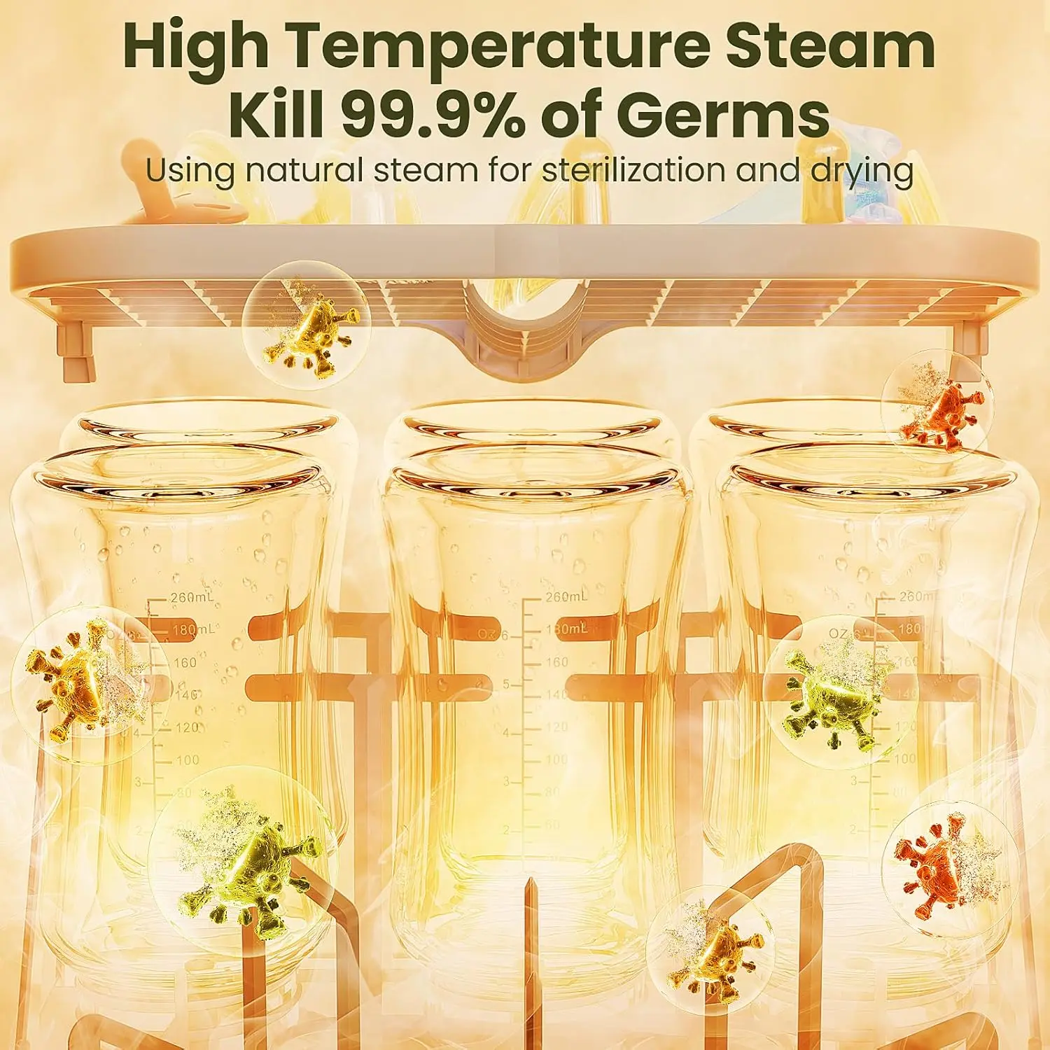 Features high-temperature steam sterilization, hot-air drying, and 72-hour sterile storage ā bottles stay dry and ready. Quiet operation wonāt disturb your baby or family.