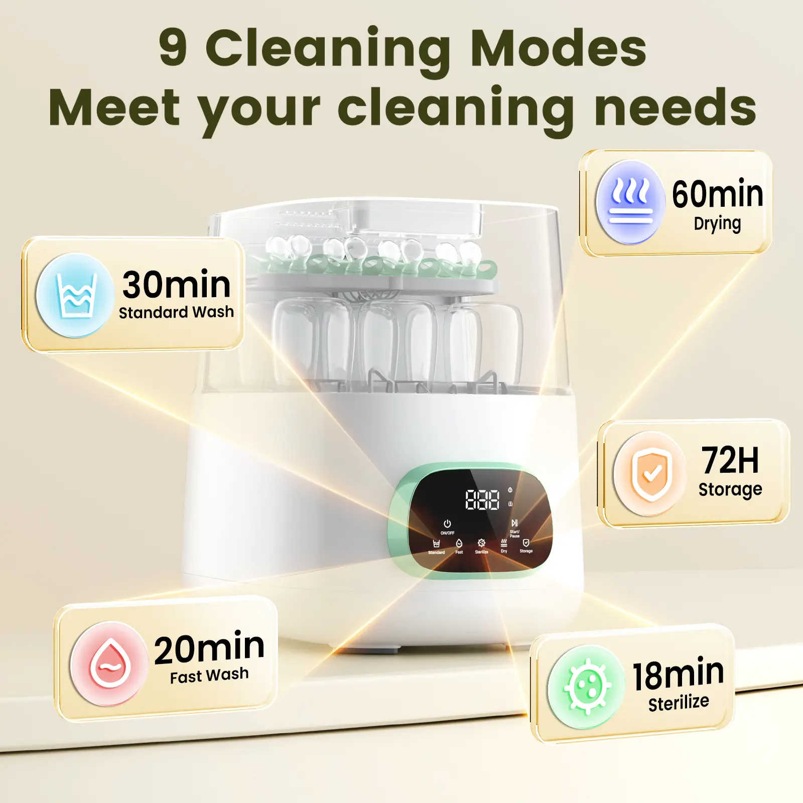 Five core functions – Standard Wash, Fast Wash, Sterilize, Dry, and Store – can be combined into 9 flexible modes. Quick Clean mode takes only 20 minutes.