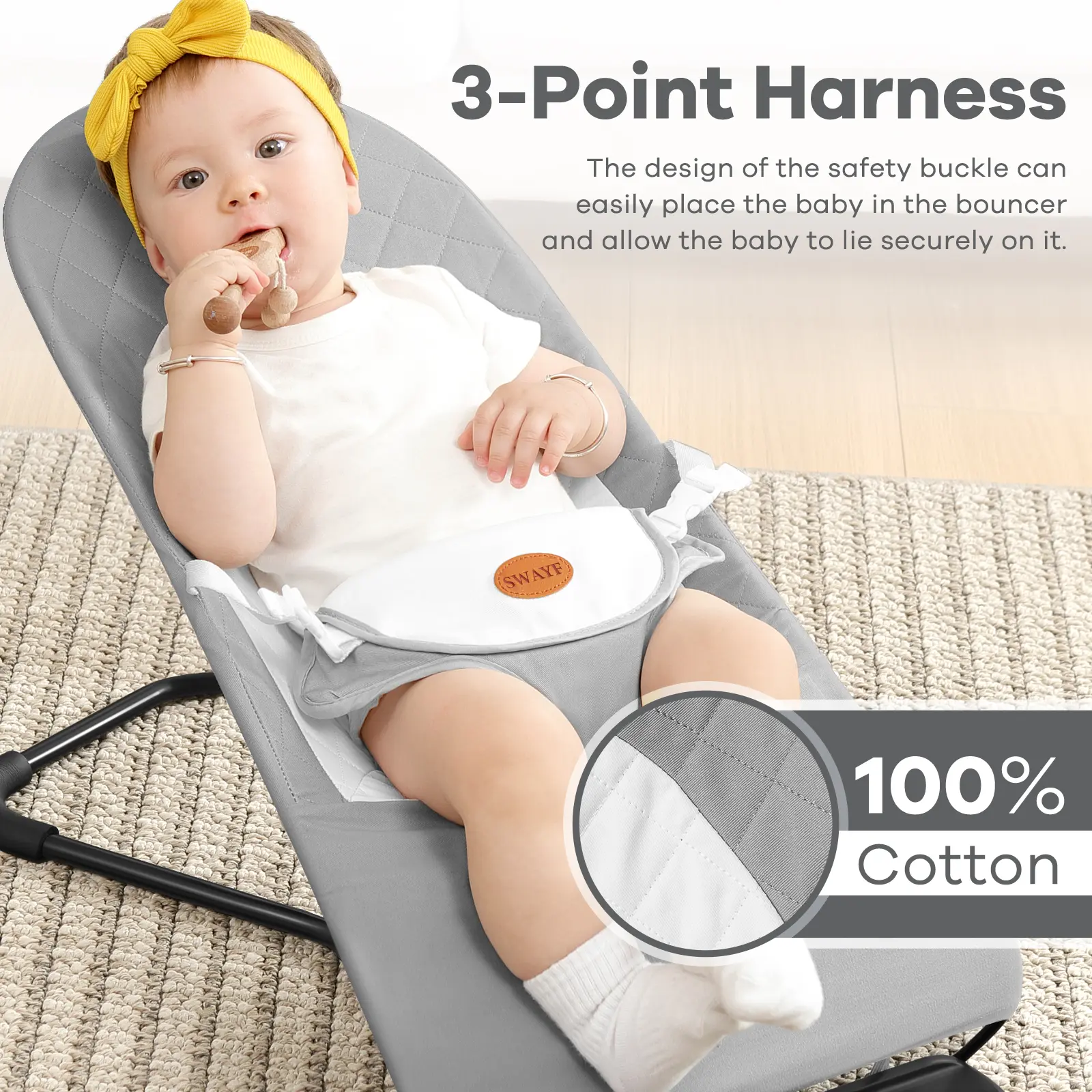 ·Safe and Adjustable: With a 3-point harness and three tilt angles, our infant bouncer guarantees safety for babies from newborns to 18 months, up to 30 pounds, providing a secure play environment