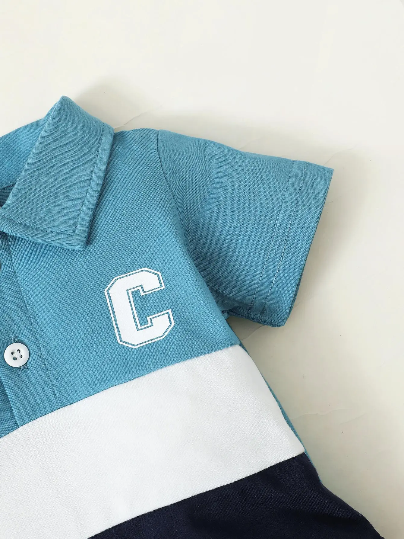 The romper is short sleeve and turn-down collar.