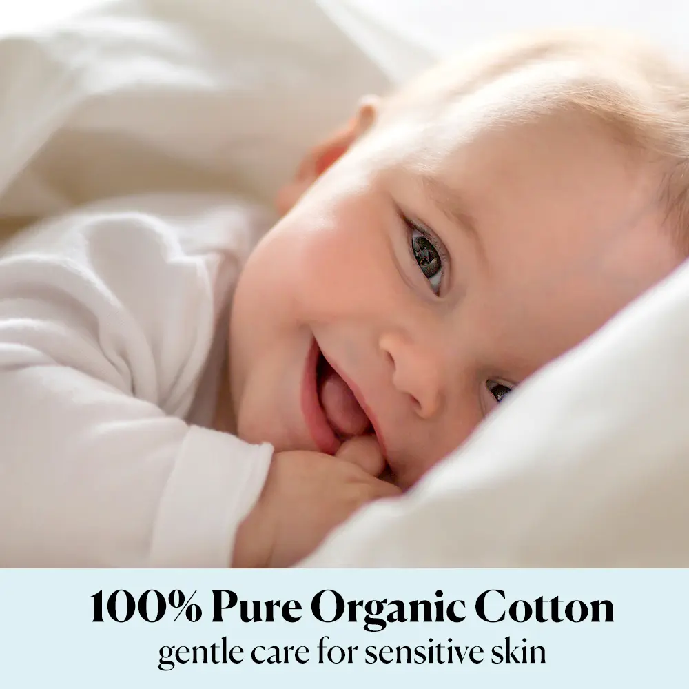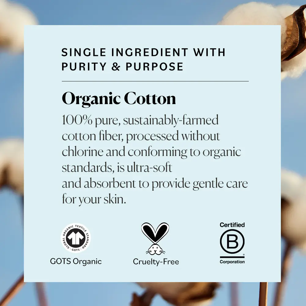 INGREDIENTS WITH PURPOSE:100% pure, sustainably-farmed cotton fiber, processed without chlorine and conforming to organic standards, is ultra-soft and absorbent to provide gentle care for skin.